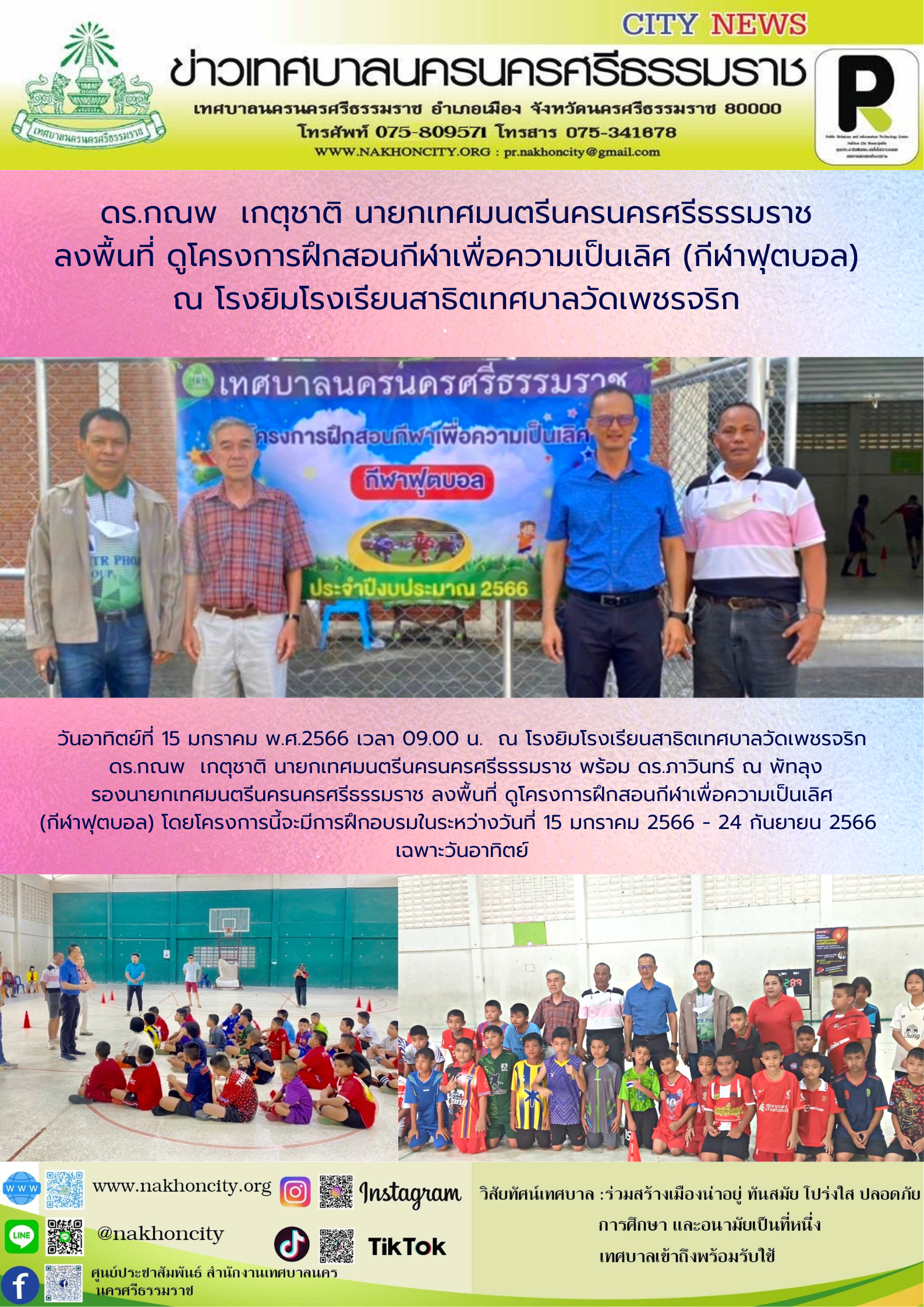 | ดร.กณพ เกตุชาติ นายกเทศมนตรีนครนครศรีธรรมราช พร้อม ดร.ภาวินทร์ ณ พัทลุง รองนายกเทศมนตรีนครนครศรีธรรมราช ลงพื้นที่ ดูโครงการฝึกสอนกีฬาเพื่อความเป็นเลิศ (กีฬาฟุตบอล) ณ โรงยิมโรงเรียนสาธิตเทศบาลวัดเพชรจริก |