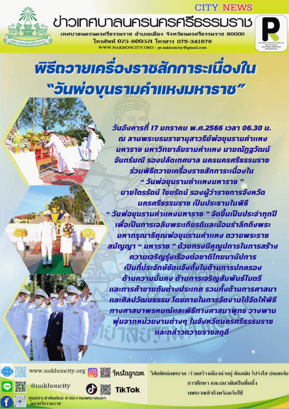 | นายณัฏฐวัฒน์ จันทร์มณี รองปลัดเทศบาลนครนครศรีธรรมราช ร่วมพิธีถวายเครื่องราชสักการะเนื่องใน “วันพ่อขุนรามคำแหงมหาราช” |