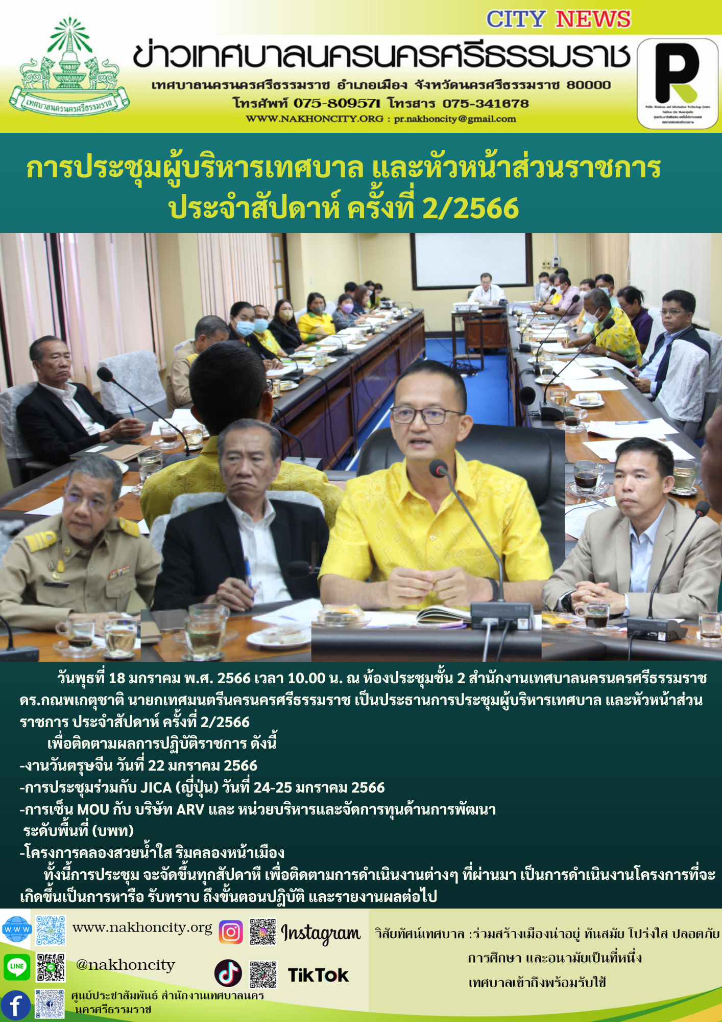 | วันพุธที่ 18 มกราคม พ.ศ. 2566 เวลา 10.00 น. ณ ห้องประชุมชั้น 2 สำนักงานเทศบาลนครนครศรีธรรมราช ดร.กณพ เกตุชาติ นายกเทศมนตรีนครนครศรีธรรมราช เป็นประธานการประชุมผู้บริหารเทศบาล และหัวหน้าส่วนราชการ ประจำสัปดาห์ ครั้งที่ 2/2566 เพื่อติดตามผลการปฏิบัติราชการ ดังนี้
