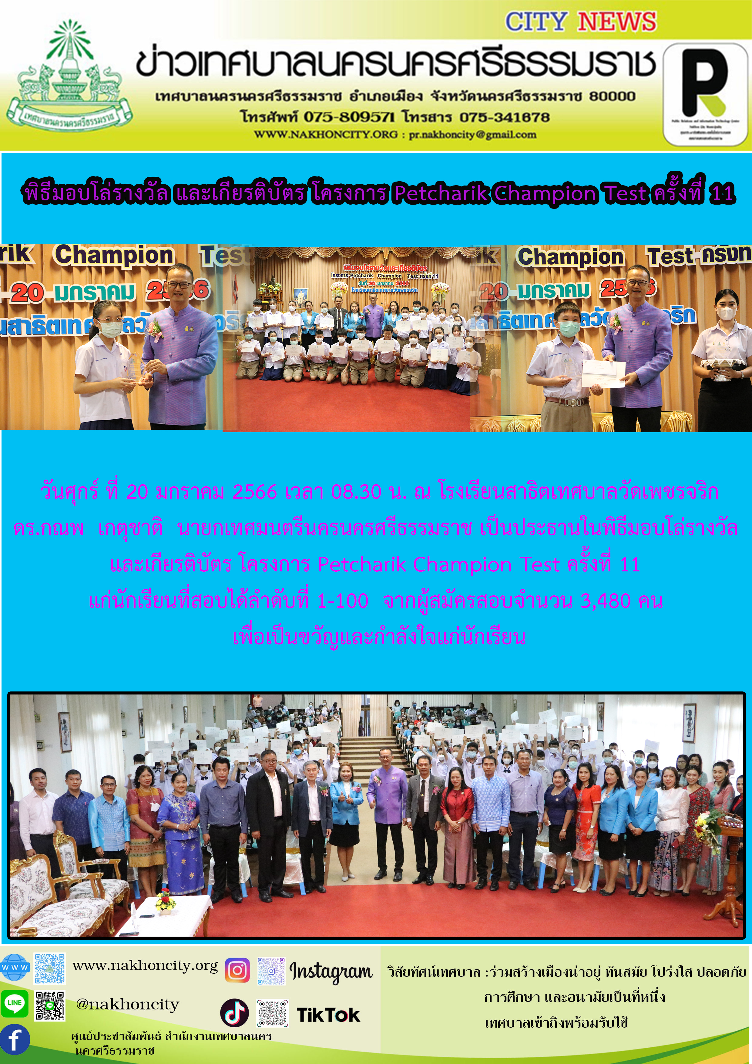 | วันศุกร์ ที่ 20 มกราคม 2566 เวลา 08.30 น. ณ โรงเรียนสาธิตเทศบาลวัดเพชรจริก ดร.กณพ เกตุชาติ นายกเทศมนตรีนครนครศรีธรรมราช เป็นประธานในพิธีมอบโล่รางวัล และเกียรติบัตร โครงการ Petcharik Champion Test ครั้งที่ 11 แก่นักเรียนที่สอบได้ลำดับที่ 1-100 จากผู้สมัครสอบจำนวน 3,480 คน เพื่อเป็นขวัญและกำลังใจแก่นักเรียน