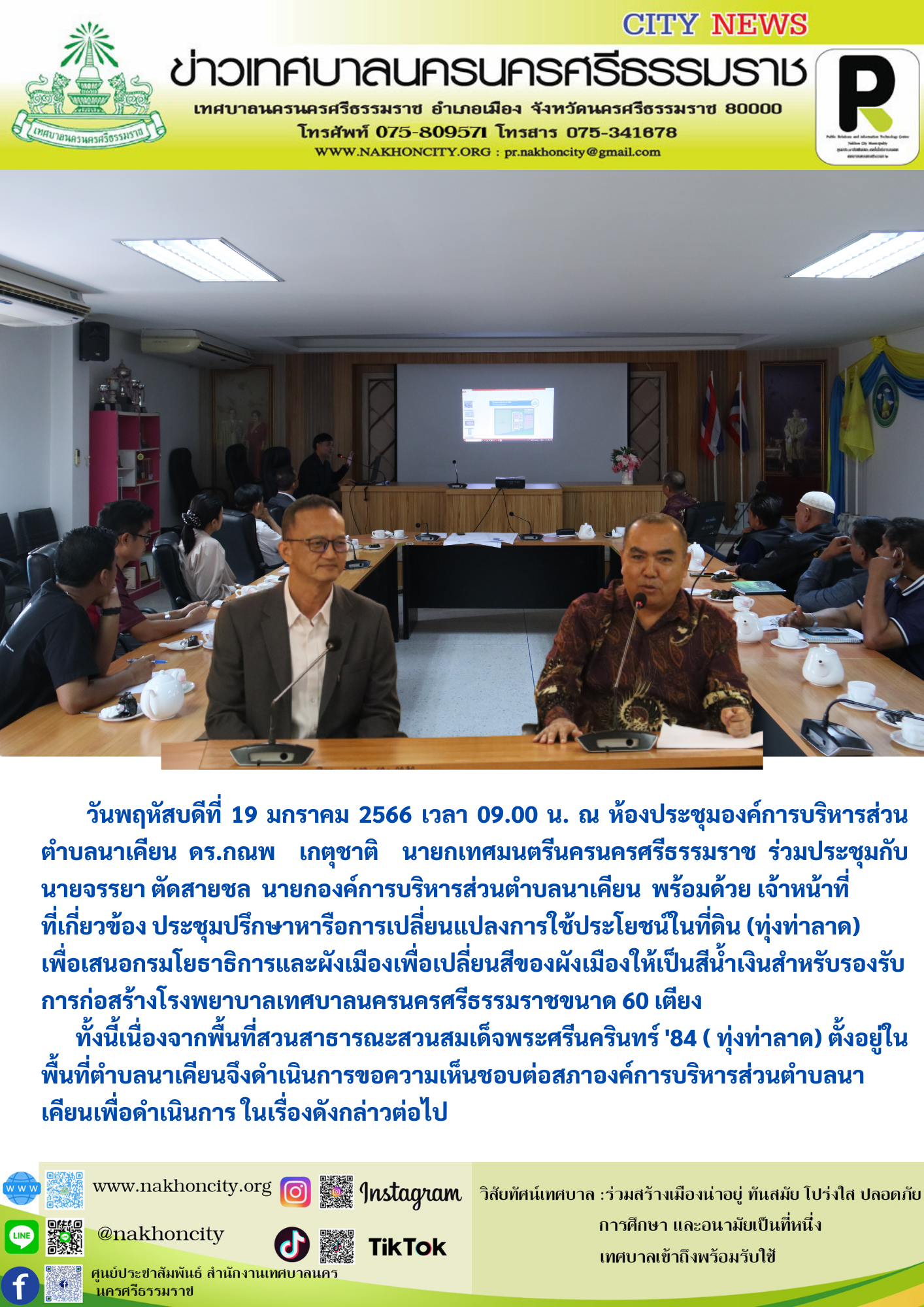 | วันพฤหัสบดีที่ 19 มกราคม 2566 เวลา 09.00 น. ณ ห้องประชุมองค์การบริหารส่วนตำบลนาเคียน ดร.กณพ  เกตุชาติ  นายกเทศมนตรีนครนครศรีธรรมราช ร่วมประชุมกับ นายจรรยา ตัดสายชล  นายกองค์การบริหารส่วนตำบลนาเคียน  พร้อมด้วย เจ้าหน้าที่ที่เกี่ยวข้อง ประชุมปรึกษาหารือการเปลี่ยนแปลงการใช้ประโยชน์ในที่ดิน ( ทุ่งท่าลาด) เพื่อเสนอกรมโยธาธิการและผังเมืองเพื่อเปลี่ยนสีของผังเมืองให้เป็นสีน้ำเงินสำหรับรองรับการก่อสร้างโรงพยาบาลเทศบาลนครนครศรีธรรมราชขนาด 60 เตียง |