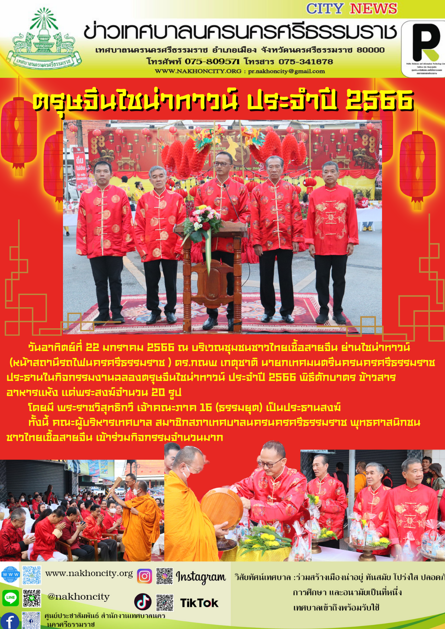 | วันอาทิตย์ที่ 22 มกราคม 2566 ณ บริเวณชุมชนชาวไทยเชื้อสายจีน ย่านไชน่าทาวน์ (หน้าสถานีรถไฟนครศรีธรรมราช ) ดร.กณพ เกตุชาติ นายกเทศมนตรีนครนครศรีธรรมราช ประธานในกิจกรรมงานฉลองตรุษจีนไชน่าทาวน์ ประจำปี 2566 พิธีตักบาตร ข้าวสาร อาหารแห้ง แด่พระสงฆ์จำนวน 20 รูป โดยมี พระราชวิสุทธิกวี เจ้าคณะภาค 16 (ธรรมยุต) เป็นประธานสงฆ์ ทั้งนี้ คณะผู้บริหารเทศบาล สมาชิกสภาเทศบาลนครนครศรีธรรมราช พุทธศาสนิกชน ชาวไทยเชื้อสายจีน เข้าร่วมกิจกรรมจำนวนมาก |
