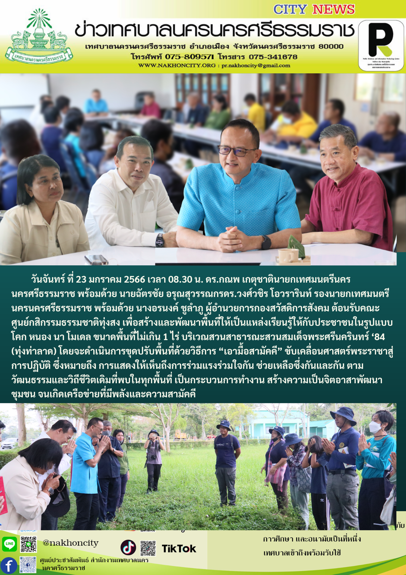 | วันจันทร์ ที่ 23 มกราคม 2566 เวลา 08.30 น. เพื่อสร้างและพัฒนาพื้นที่ให้เป็นแหล่งเรียนรู้ให้กับประชาชนในรูปแบบโคก หนอง นา โมเดล ขนาดพื้นที่ไม่เกิน 1 ไร่ บริเวณสวนสาธารณะสวนสมเด็จพระศรีนครินทร์ ‘84 (ทุ่งท่าลาด) โดยจะดำเนินการขุดปรับพื้นที่ด้วยวิธีการ “เอามื้อสามัคคี” ขับเคลื่อนศาสตร์พระราชาสู่การปฏิบัติ ซึ่งหมายถึง การแสดงให้เห็นถึงการร่วมแรงร่วมใจกัน ช่วยเหลือซึ่งกันและกัน ตามวัฒนธรรมและวิถีชีวิตเดิมที่พบในทุกพื้นที่ เป็นกระบวนการทำงาน สร้างความเป็นจิตอาสาพัฒนาชุมชน จนเกิดเครือข่ายที่มีพลังและความสามัคคี |