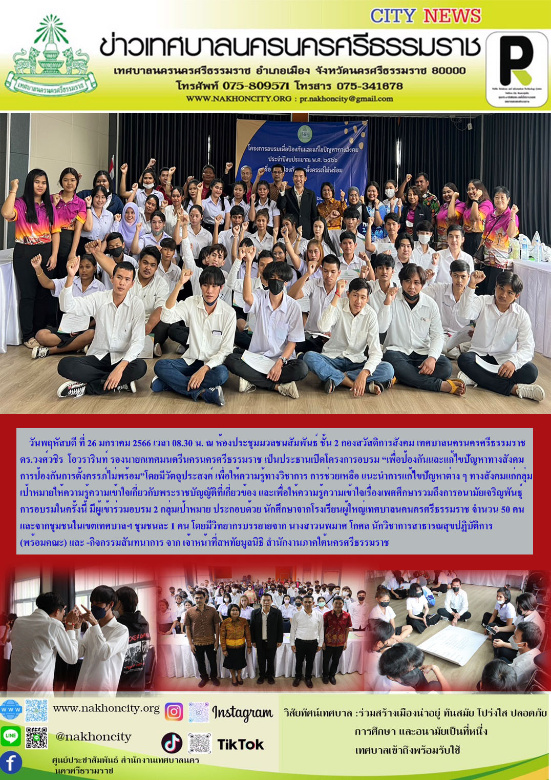| วัน พฤหัสบดี ที่ 26 มกราคม 2566 เวลา 08.30 น. ณ ห้องประชุมมวลชนสัมพันธ์ ชั้น 2 กองสวัสดิการสังคม เทศบาลนครนครศรีธรรมราช ดร.วงศ์วชิร โอวรารินท์ รองนายกเทศมนตรีนครนครศรีธรรมราช เป็นประธานเปิดโครงการอบรม “เพื่อป้องกันและแก้ไขปัญหาทางสังคมการป้องกันการตั้งครรภ์ไม่พร้อม”โดยมีวัตถุประสงค์ เพื่อให้ความรู้ทางวิชาการ การช่วยเหลือ แนะนำการแก้ไขปัญหาต่าง ๆ ทางสังคมแก่กลุ่มเป้าหมายให้ความรู้ความเข้าใจเกี่ยวกับพระราชบัญญัติที่เกี่ยวข้อง และเพื่อให้ความรู้ความเข้าใจเรื่องเพศศึกษารวมถึงการอนามัยเจริญพันธุ์ การอบรมในครั้งนี้ มีผู้เข้าร่วมอบรม 2 กลุ่มเป้าหมาย ประกอบด้วย นักศึกษาจากโรงเรียนผู้ใหญ่เทศบาลนครนครศรีธรรมราช จำนวน 50 คน และจากชุมชนในเขตเทศบาลฯ ชุมชนละ 1 คน โดยมีวิทยากรบรรยายจาก นางสาวนพมาศ โกศล นักวิชาการสาธารณสุขปฏิบัติการ (พร้อมคณะ) และ -กิจกรรมสันทนาการ จาก เจ้าหน้าที่สหทัยมูลนิธิ สำนักงานภาคใต้นครศรีธรรมราช