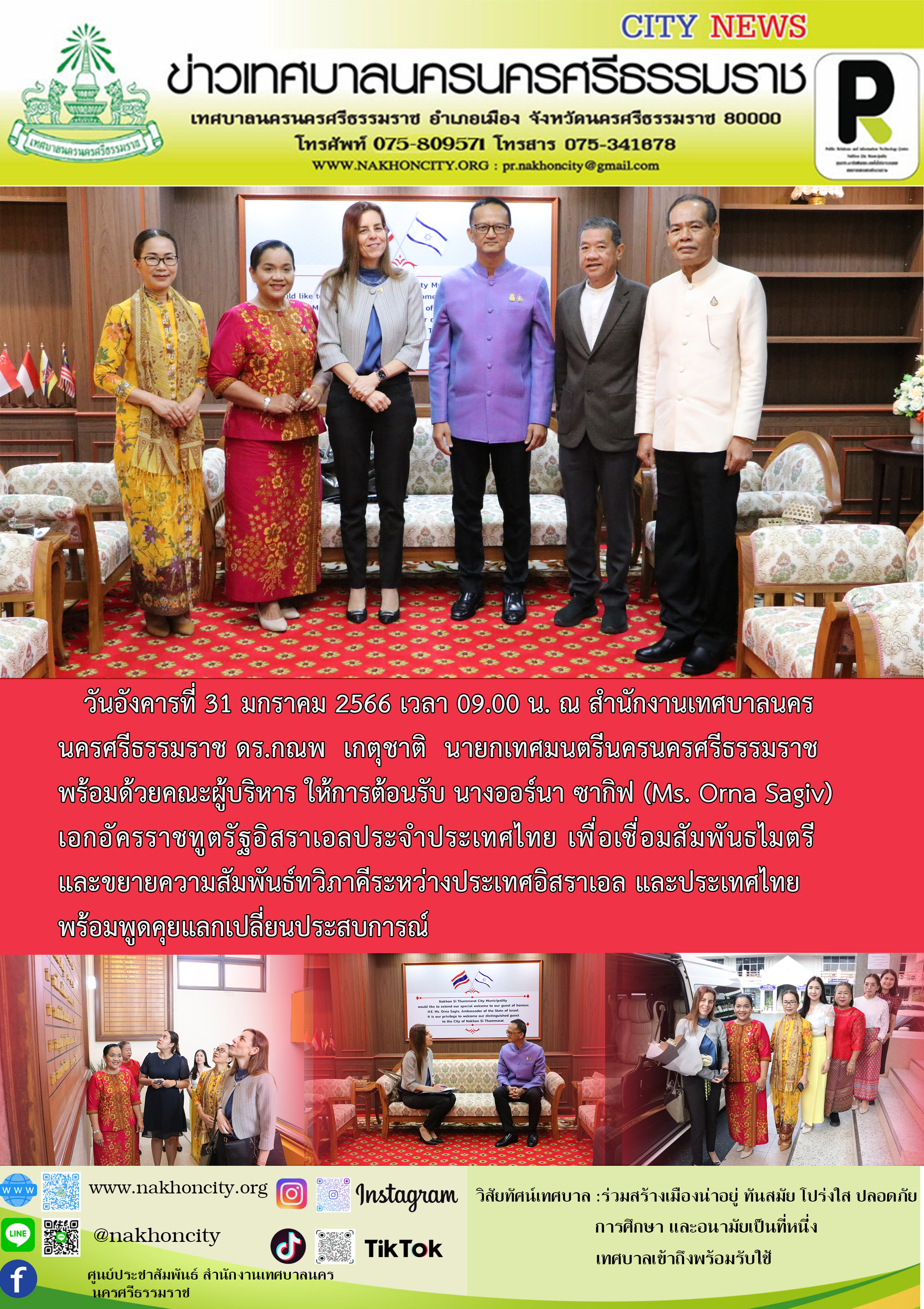 | นายกเทศมนตรีนครนครศรีธรรมราช พร้อมด้วยคณะผู้บริหาร ให้การต้อนรับนางออร์นา ซากิฟ (Ms. Orna Sagiv) เอกอัครราชทูตรัฐอิสราเอลประจำประเทศไทย |