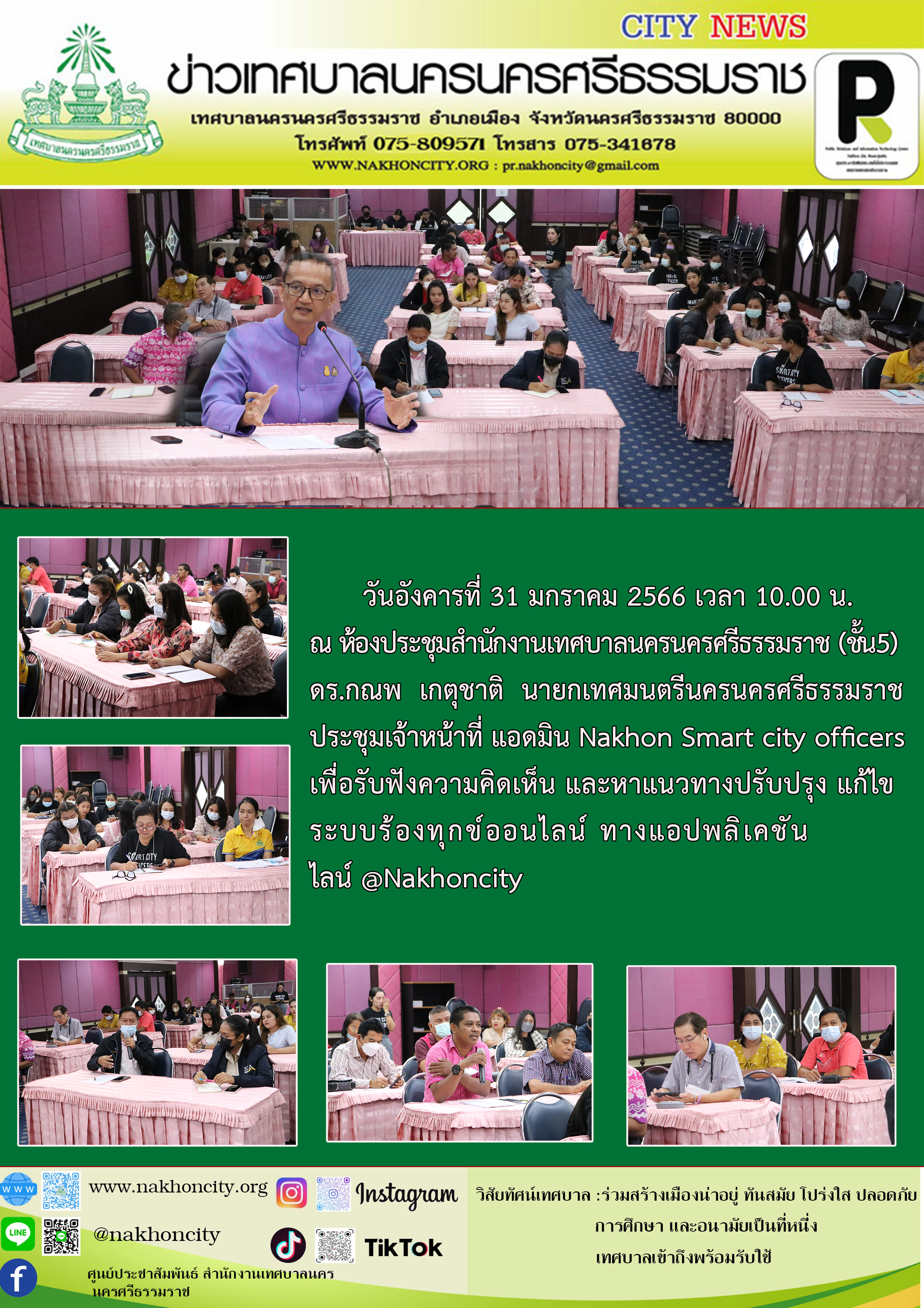 | วันอังคารที่ 31 มกราคม 2566 เวลา 10.00 น. ณ ห้องประชุมสำนักงานเทศบาลนครนครศรีธรรมราช (ชั้น5) ดร.กณพ เกตุชาติ นายกเทศมนตรีนครนครศรีธรรมราช ประชุมเจ้าหน้าที่ แอดมิน Nakhon Smart city officers เพื่อรับฟังความคิดเห็น และหาแนวทางปรับปรุง แก้ไขระบบร้องทุกข์ออนไลน์ ทางแอปพลิเคชัน ไลน์ @Nakhoncity ภาพ//ข่าว//ไกรสิทธิ |