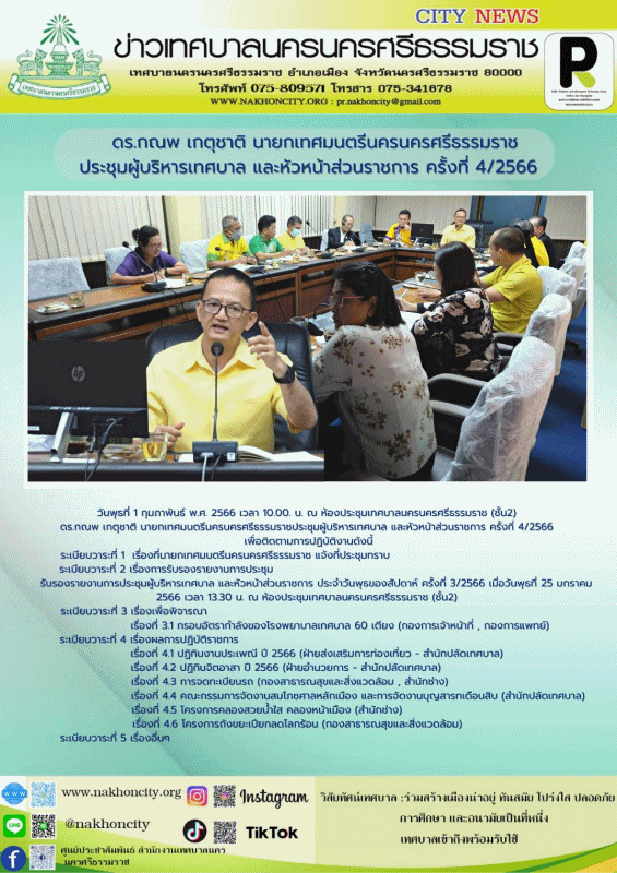 | ดร.กณพ เกตุชาติ นายกเทศมนตรีนครนครศรีธรรมราช ประชุมผู้บริหารเทศบาล และหัวหน้าส่วนราชการ ครั้งที่ 4/2566 |