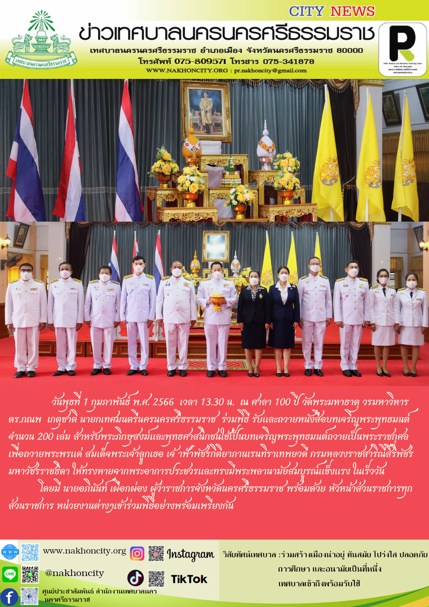 | ดร.กณพ เกตุชาติ นายกเทศมนตรีนครนครศรีธรรมราช ร่วมพิธี รับและถวายหนังสือบทเจริญพระพุทธมนต์ จำนวน 200 เล่ม |