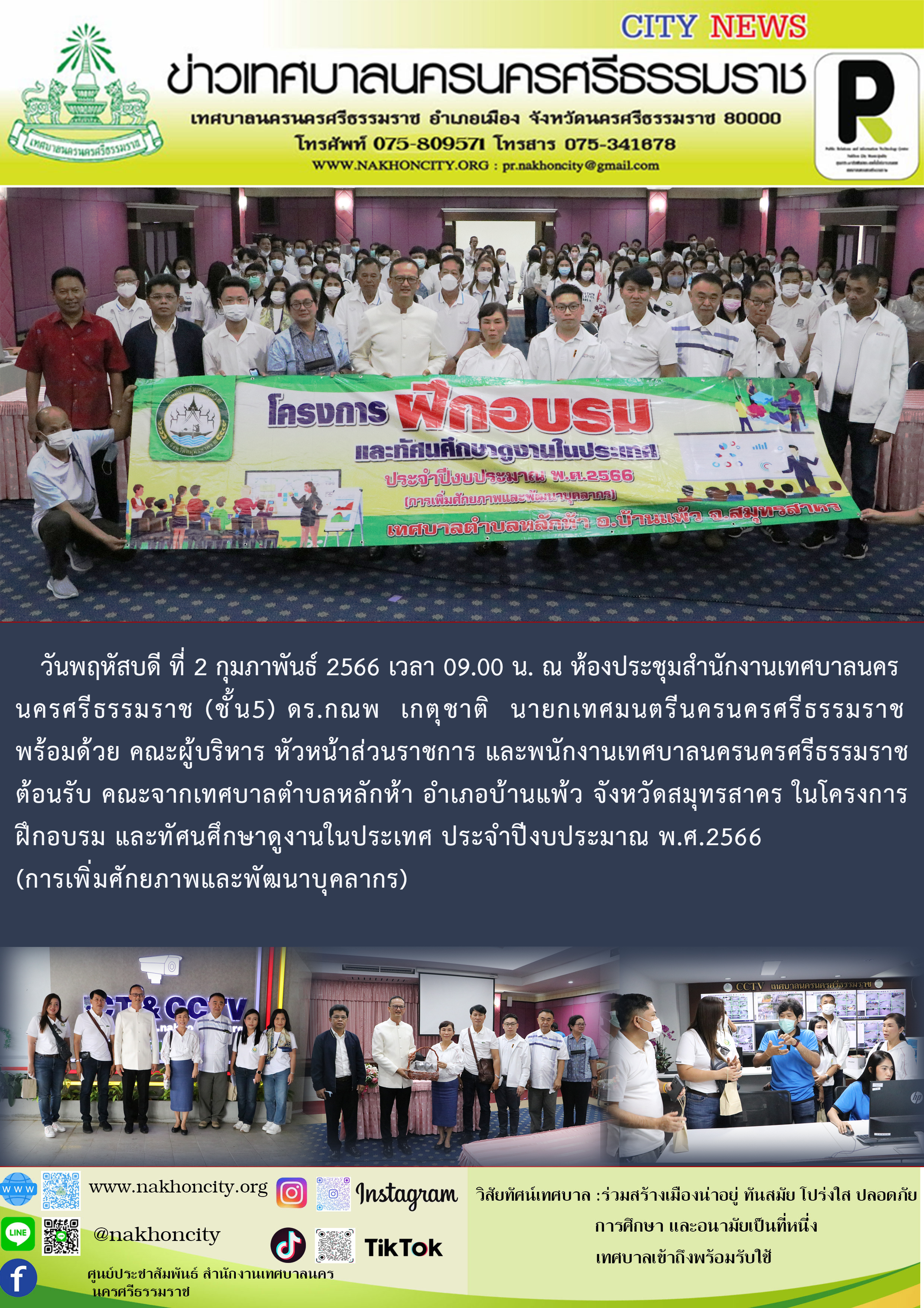 | นายกเทศมนตรีนครนครศรีธรรมราช ต้อนรับคณะจากเทศบาลตำบลหลักห้า อำเภอบ้านแพ้ว จังหวัดสมุทรสาคร ในโครงการฝึกอบรม และทัศนศึกษาดูงานในประเทศ ประจำปีงบประมาณ พ.ศ.2566 (การเพิ่มศักยภาพและพัฒนาบุคลากร) |