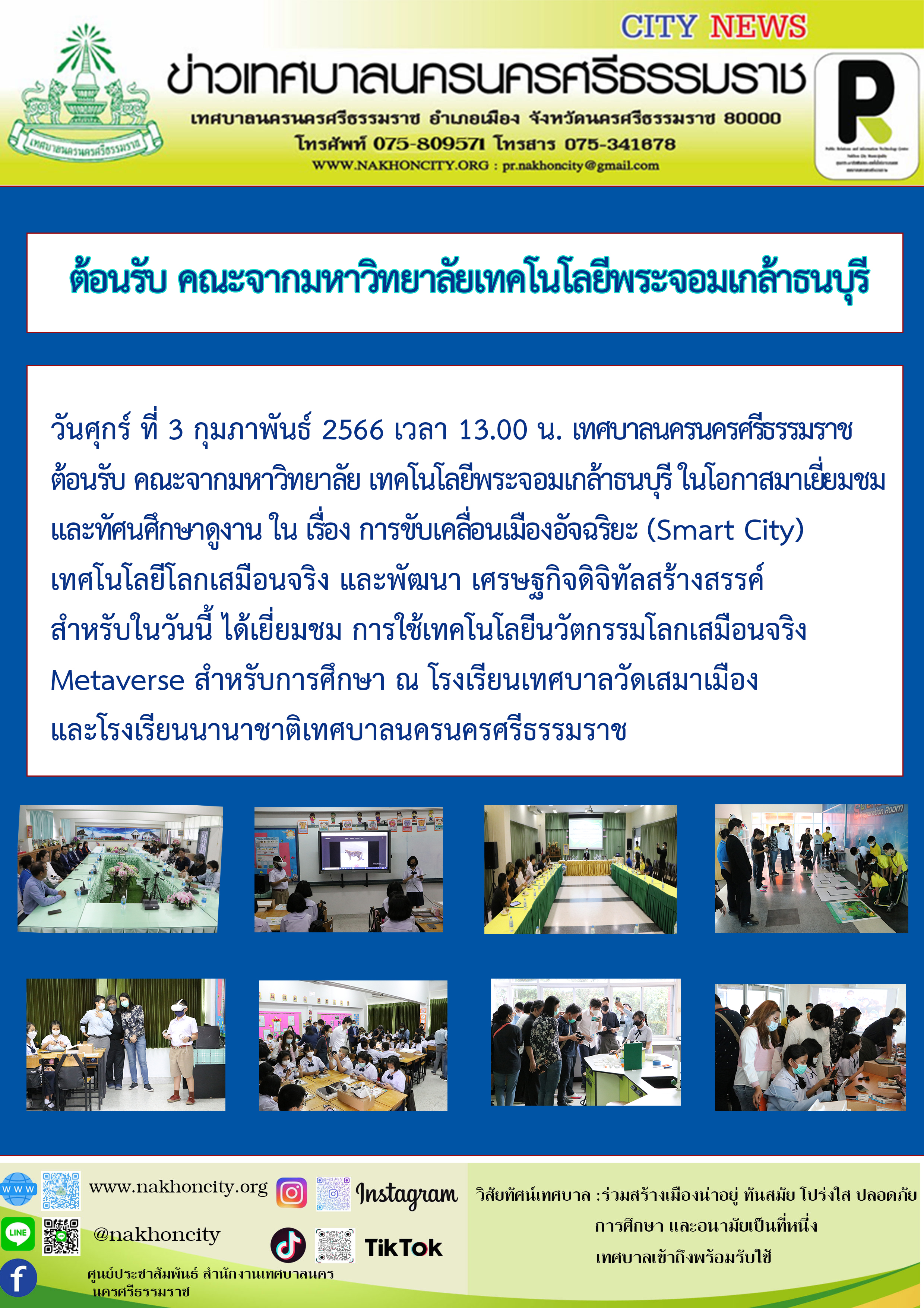 | วันศุกร์ ที่ 3 กุมภาพันธ์ 2566 เวลา 13.00 น. เทศบาลนครนครศรีธรรมราช ต้อนรับคณะจากมหาวิทยาลัยเทคโนโลยีพระจอมเกล้าธนบุรี ในโอกาสมาเยี่ยมชม และทัศนศึกษาดูงาน ใน เรื่อง การขับเคลื่อนเมืองอัจฉริยะ (Smart City) เทศโนโลยีโลกเสมือนจริง และพัฒนาเศรษฐกิจดิจิทัลสร้างสรรค์ สำหรับในวันนี้ ได้เยี่ยมชม การใช้เทคโนโลยีนวัตกรรมโลกเสมือนจริง Metaverse สำหรับการศึกษา ณ โรงเรียนเทศบาลวัดเสมาเมือง และโรงเรียนนานาชาติเทศบาลนครนครศรีธรรมราช