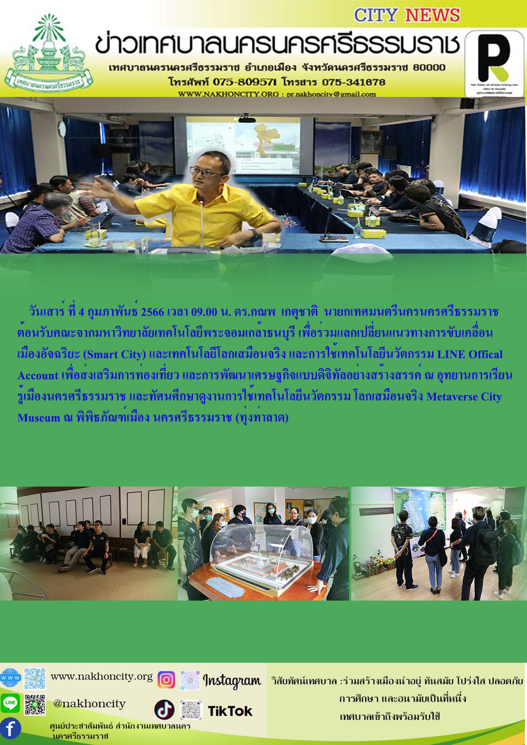 | วันเสาร์ ที่ 4 กุมภาพันธ์ 2566 เวลา 09.00 น. ดร.กณพ เกตุชาติ นายกเทศมนตรีนครนครศรีธรรมราช ต้อนรับคณะจากมหาวิทยาลัยเทคโนโลยีพระจอมเกล้าธนบุรี เพื่อร่วมแลกเปลี่ยนแนวทางการขับเคลื่อน เมืองอัจฉริยะ (Smart City) และเทคโนโลยีโลกเสมือนจริง และการใช้เทคโนโลยีนวัตกรรม LINE Offical Account เพื่อส่งเสริมการท่องเที่ยว และการพัฒนาเศรษฐกิจแบบดิจิทัลอย่างสร้างสรรค์ ณ อุทยานการเรียนรู้เมืองนครศรีธรรมราช และทัศนศึกษาดูงานการใช้เทคโนโลยีนวัตกรรม โลกเสมือนจริง Metaverse City Museum ณ พิพิธภัณฑ์เมือง นครศรีธรรมราช (ทุ่งท่าลาด)