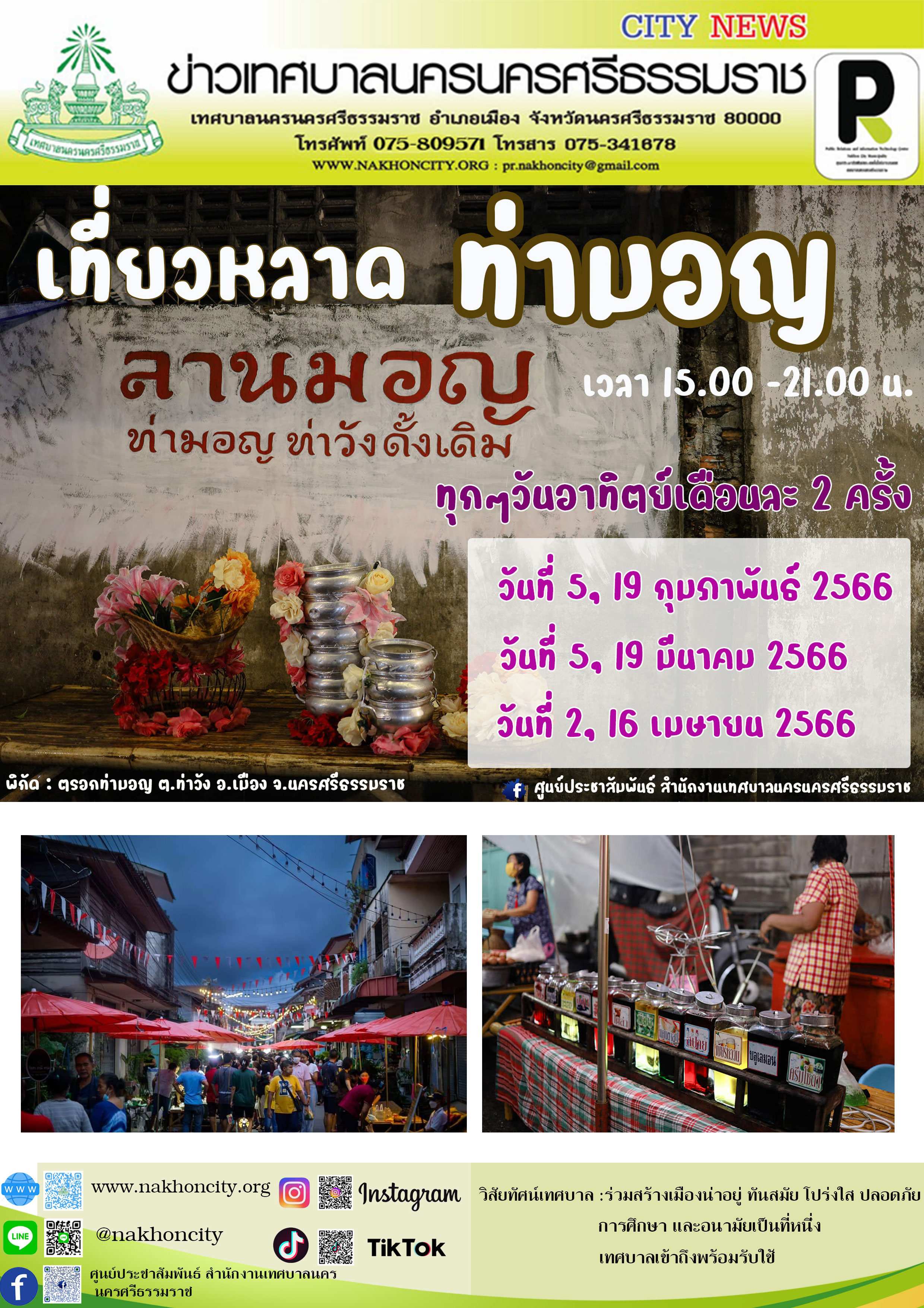 | เทศบาลนครนครศรีธรรมราช ขอเชิญเที่ยวงาน “ตลาดท่ามอญ” ชุมชนเก่าแก่กลางเมืองนครศรีธรรมราช ตลาดชุมชนแบบดั้งเดิม ณ ตรอกท่ามอญ บริเวณเชิงสะพานราเมศวร์ ถนนคนเดิน แนวยาวไปจนถึงวัดศรีทวี หลาดท่ามอญเป็นการขับเคลื่อนเศรษฐกิจและสังคมฐานราก เป็นความรับผิดชอบของ มหาวิทยาลัยราชภัฎนครศรีธรรมราช จัดขึ้นเพื่อให้เป็นแหล่งท่องเที่ยว สามารถสร้างรายได้แก่ชุมชนทุกเพศทุกวัย มีภาพศิลปะ มุมถ่ายภาพสวยงามเต็มไปด้วยกลิ่นอายวัฒนธรรมดั้งเดิมชุมชนชาวมอญ มีของกิน ของใช้ให้เลือกมากมายที่ชาวบ้านได้นำมาจำหน่าย และมีการแสดงพื้นเมืองของเยาวชนในชุมชน การแสดงดนตรี/ศิลปะร่วมสมัยของเยาวชน นิทรรศการ และยังมีจุดเช็คอิน เซลฟี่กับกำแพงงานศิลปะสุดว๊าว ร่วมย้อนรำลึกถึงชุมชนโบราณจากเรื่องเล่าของคนท่ามอญ สายกิน สายแช๊ะ และสายอาร์ตอีกด้วย “หลาดท่ามอญ” ท่าวัง เปิดทุกวันอาทิตย์ (เดือนละ 2 ครั้ง) ตั้งแต่เวลา 15.00 -22.00 น. วันที่ 5,19 กุมภาพันธ์ 2566 วันที่ 5, 19 มีนาคม 2566 วันที่ 2, 16 เมษายน 2566 ............... ข่าว//จันทร์จิรา อินโฟ//สิริญญา |
