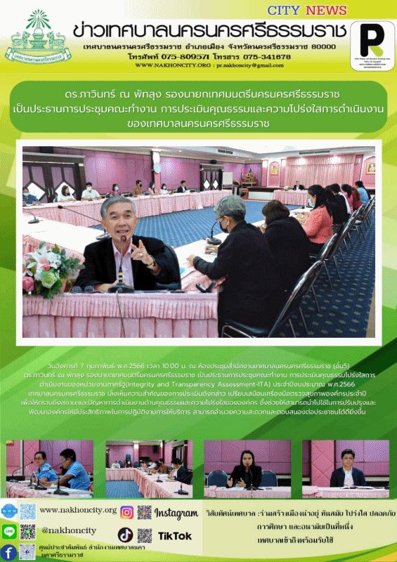 | ดร.ภาวินทร์ ณ พัทลุง รองนายกเทศมนตรีนครนครศรีธรรมราช เป็นประธานการประชุมคณะทำงาน การประเมินคุณธรรมและความโปร่งใสการดำเนินงานของเทศบาลนครนครศรีธรรมราช |