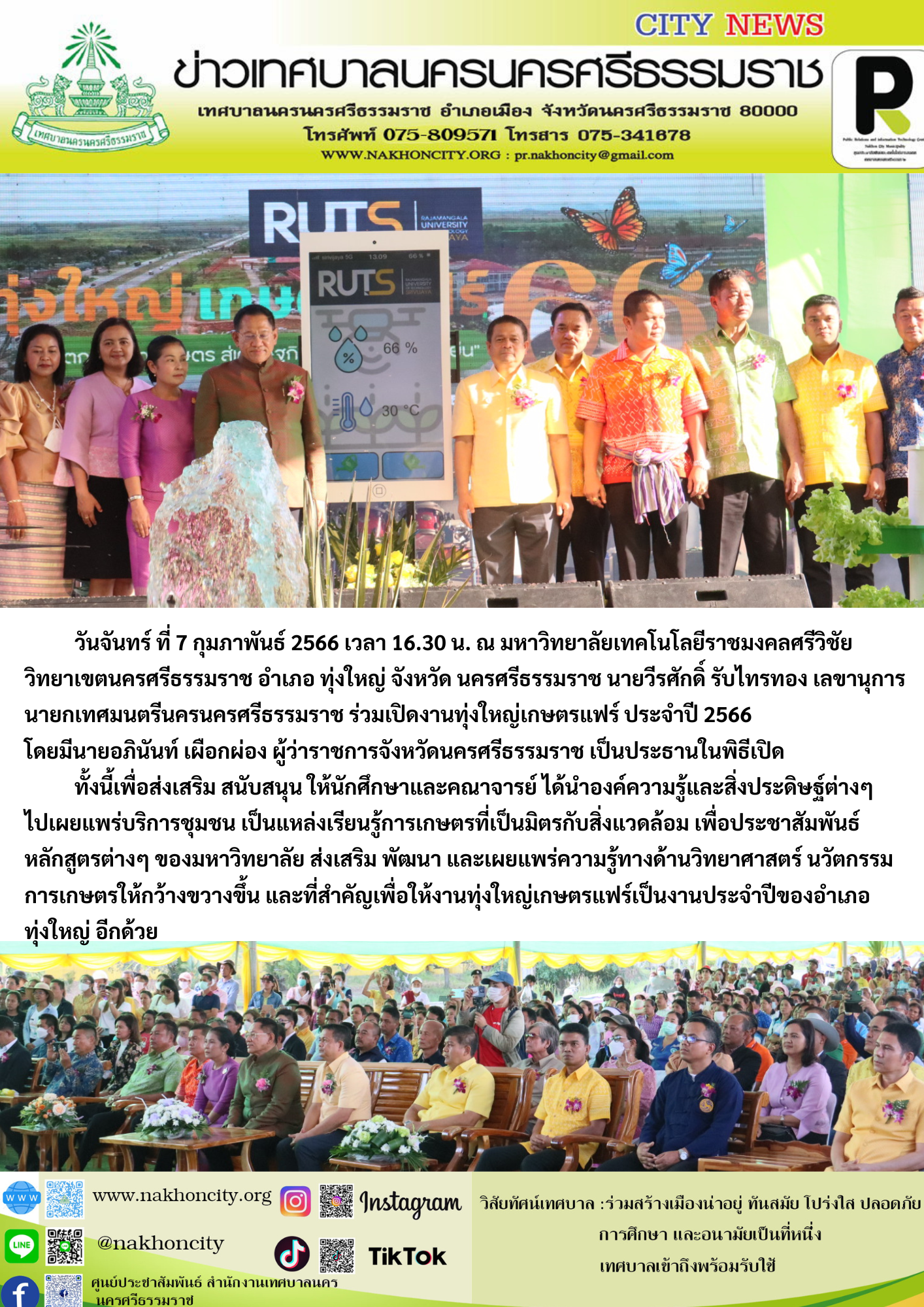 | วันจันทร์ ที่ 7 กุมภาพันธ์ 2566 เวลา 16.30 น. ณ มหาวิทยาลัยเทคโนโลยีราชมงคลศรีวิชัย วิทยาเขตนครศรีธรรมราช อำเภอ ทุ่งใหญ่ จังหวัด นครศรีธรรมราช นายวีรศักดิ์ รับไทรทอง เลขานุการนายกเทศมนตรีนครนครศรีธรรมราช ร่วมเปิดงานทุ่งใหญ่เกษตรแฟร์ ประจำปี 2566 โดยมีนายอภินันท์ เผือกผ่อง ผู้ว่าราชการจังหวัดนครศรีธรรมราช เป็นประธานในพิธีเปิด ทั้งนี้เพื่อส่งเสริม สนับสนุน ให้นักศึกษาและคณาจารย์ ได้นำองค์ความรู้และสิ่งประดิษฐ์ต่างๆ ไปเผยแพร่บริการชุมชน เป็นแหล่งเรียนรู้การเกษตรที่เป็นมิตรกับสิ่งแวดล้อม เพื่อประชาสัมพันธ์หลักสูตรต่างๆ ของมหาวิทยาลัย ส่งเสริม พัฒนา และเผยแพร่ความรู้ทางด้านวิทยาศาสตร์ นวัตกรรมการเกษตรให้กว้างขวางขึ้น และที่สำคัญเพื่อให้งานทุ่งใหญ่เกษตรแฟร์เป็นงานประจำปีของอำเภอทุ่งใหญ่ อีกด้วย |