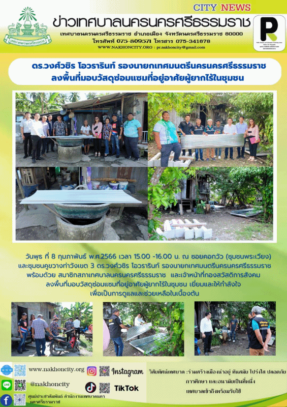 | ดร.วงศ์วชิร โอวรารินท์ รองนายกเทศมนตรีนครนครศรีธรรมราช ลงพื้นที่มอบวัสดุซ่อมแซมที่อยู่อาศัยผู้ยากไร้ในชุมชน |