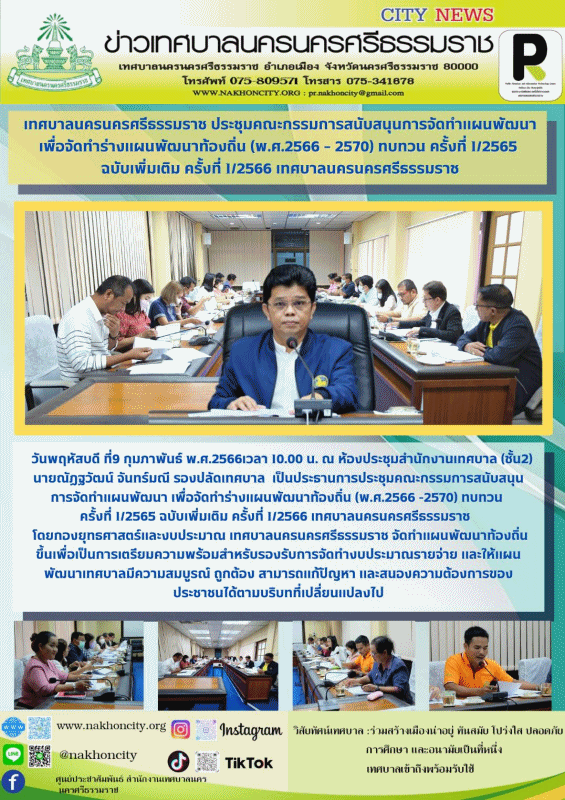 | เทศบาลนครนครศรีธรรมราช ประชุมคณะกรรมการสนับสนุนการจัดทำแผนพัฒนา เพื่อจัดทำร่างแผนพัฒนาท้องถิ่น (พ.ศ.2566 – 2570) ทบทวน ครั้งที่ 1/2565 ฉบับเพิ่มเติม ครั้งที่ 1/2566 เทศบาลนครนครศรีธรรมราช |