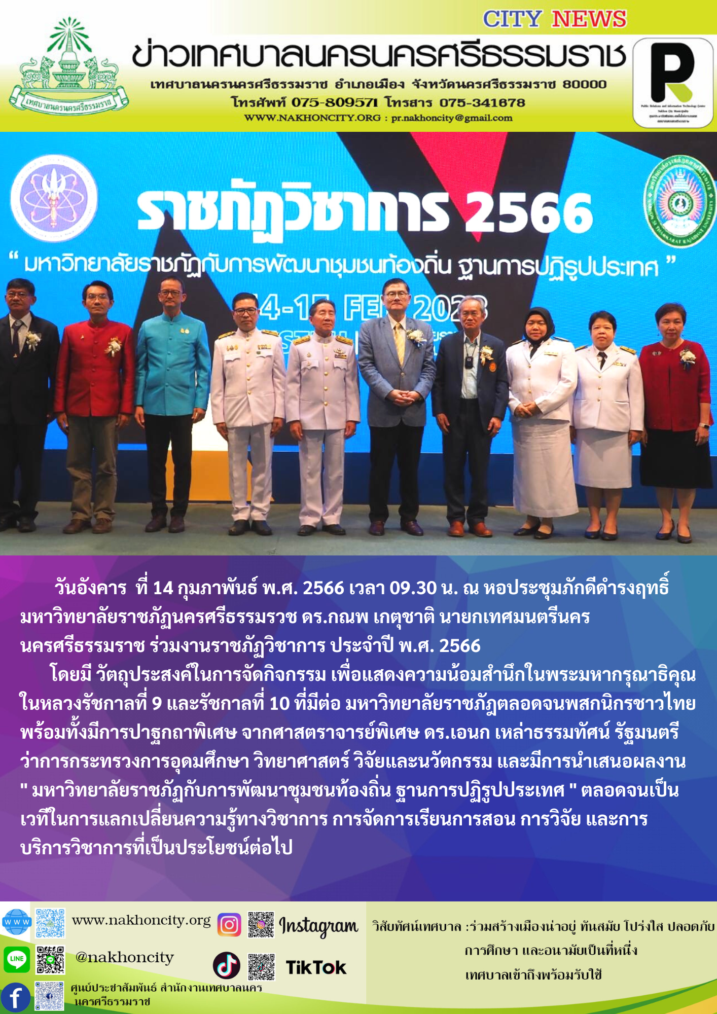 | วันอังคารที่ 14 กุมภาพันธ์ พ.ศ. 2566 เวลา 09.30 น. ณ หอประชุมภักดีดำรงฤทธิ์ มหาวิทยาลัยราชภัฏนครศรีธรรมรวช ดร.กณพ เกตุชาติ นายกเทศมนตรีนครนครศรีธรรมราช ร่วมงานราชภัฏวิชาการ ประจำปี พ.ศ. 2566 โดยมี วัตถุประสงค์ในการจัดกิจกรรม เพื่อแสดงความน้อมสำนึกในพระมหากรุณาธิคุณ ในหลวงรัชกาลที่ 9 และรัชกาลที่ 10 ที่มีต่อ มหาวิทยาลัยราชภัฎตลอดจนพสกนิกรชาวไทย พร้อมทั้งมีการปาฐกถาพิเศษ จากศาสตราจารย์พิเศษ ดร.เอนก เหล่าธรรมทัศน์ รัฐมนตรีว่าการกระทรวงการอุดมศึกษา วิทยาศาสตร์ วิจัยและนวัตกรรม และมีการนำเสนอผลงาน " มหาวิทยาลัยราชภัฏกับการพัฒนาชุมชนท้องถิ่น ฐานการปฏิรูปประเทศ" ตลอดจนเป็นเวทีในการแลกเปลี่ยนความรู้ทางวิชาการ การจัดการเรียนการสอน การวิจัย และการบริการวิชาการที่เป็นประโยชน์ต่อไป ภาพ/ข่าว/แสงจันทร์ ตรวจทาน/อารีรัตน์ |
