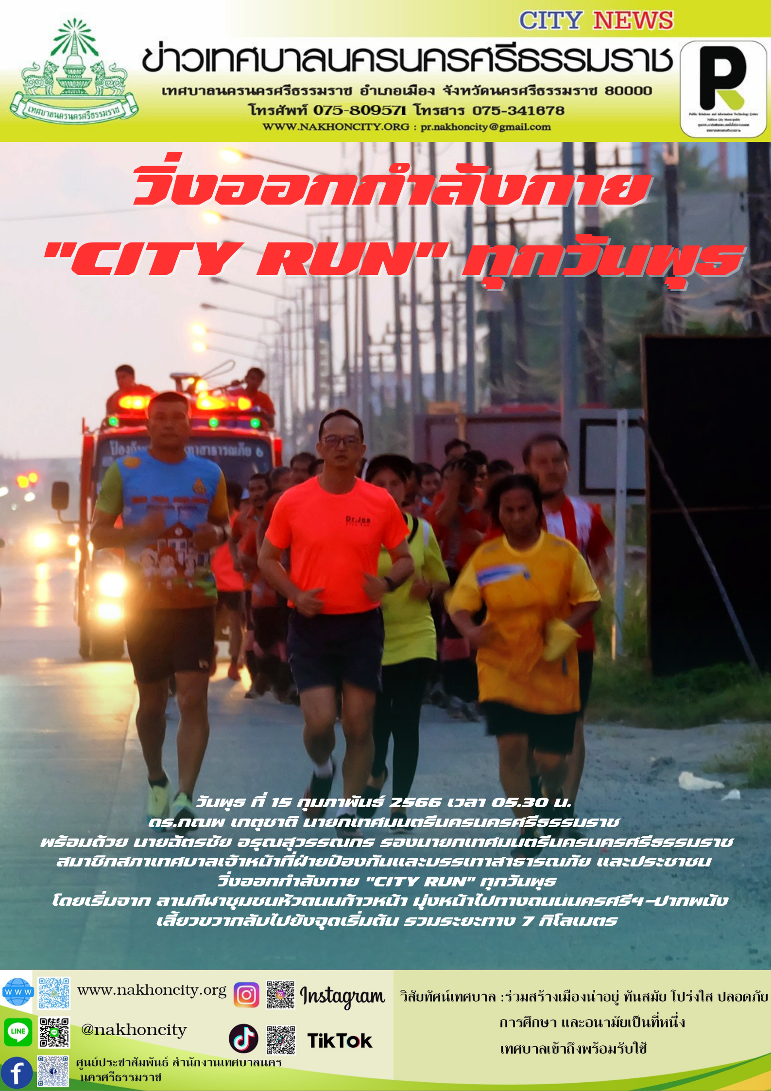 | ดร.กณพ เกตุชาติ นายกเทศมนตรีนครนครศรีธรรมราช พร้อมด้วยคณะผู้บริหาร สมาชิกสภาเทศบาล เจ้าหน้าที่ฝ่ายป้องกันและบรรเทาสาธารณภัย ประชาชนทั่วไป วิ่งออกกำลังกาย "CITY RUN" ทุกวันพุธ |