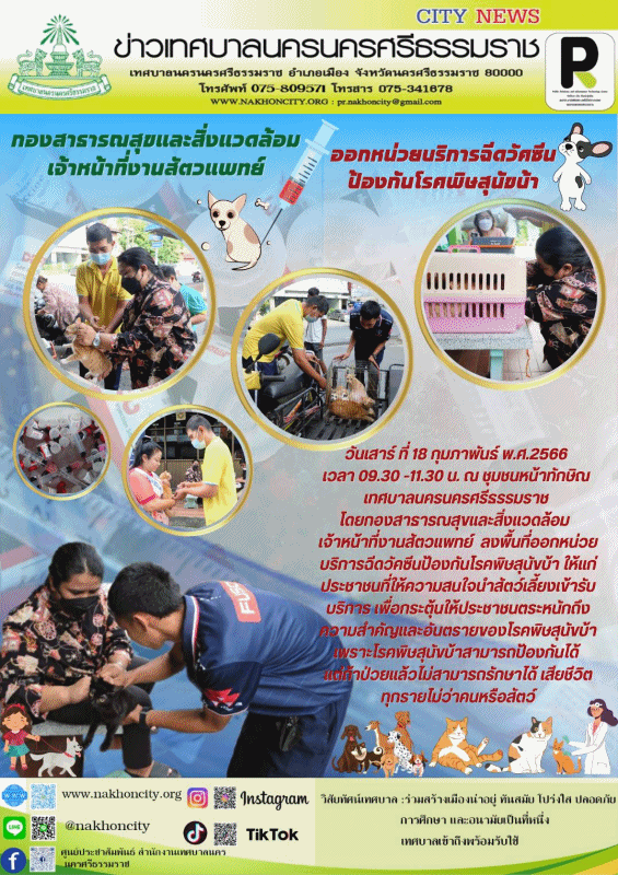 | วันเสาร์ ที่ 18 กุมภาพันธ์ พ.ศ.2566 เวลา 09.30 -11.30 น. ณ ชุมชนหน้าทักษิณ เทศบาลนนครศรีธรรมราช โดยกองสาธารณสุขและสิ่งแวดล้อม เจ้าหน้าที่งานสัตวแพทย์ ลงพื้นที่ออกหน่วยบริการฉีดวัคซีนป้องกันโรคพิษสุนัขบ้า ให้แก่ประชาชนที่ให้ความสนใจนำสัตว์เลี้ยงเข้ารับบริการ เพื่อกระตุ้นให้ประชาชนตระหนักถึงความสำคัญและอันตรายของโรคพิษสุนัขบ้า เพราะโรคพิษสุนัขบ้าสามารถป้องกันได้ แต่ถ้าป่วยแล้วไม่สามารถรักษาได้ เสียชีวิตทุกรายไม่ว่าคนหรือสัตว์ ซึ่งในวันนี้มีประชาชนทยอยนำสัตว์เลี้ยง สุนัขและแมว มาลงทะเบียนแจ้งชื่อ อายุของสัตว์เลี้ยงรับบริการฉีดวัคซีนป้องกันโรคพิษสุนัขบ้า รับใบรับรองและป้ายโลหะไปคล้องคอสัตว์เลี้ยง สามารถติดต่อสอบถามได้ที่สถานพยาบาลสัตว์ทุ่งท่าลาด โทร.075 358292 ( วัน-เวลาราชการ ) ................... ภาพ//ข่าว//จันทร์จิรา |