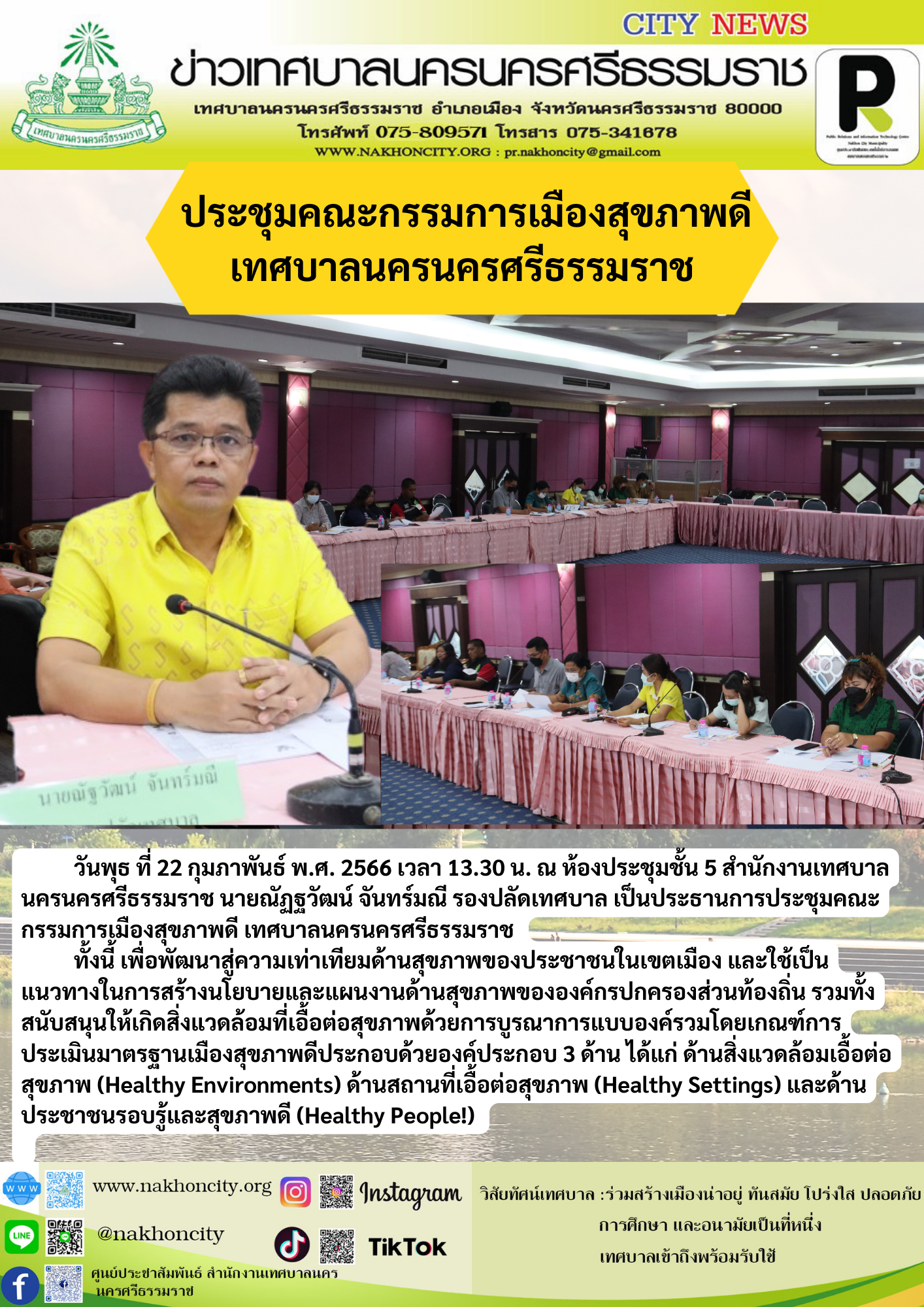 | วันพุธที่ 22 กุมภาพันธ์ พ.ศ. 2566 เวลา 13.30 น. ณ ห้องประชุมชั้น 5 สำนักงานเทศบาลนครนครศรีธรรมราช นายณัฏฐวัฒน์ จันทร์มณี รองปลัดเทศบาล เป็นประธานการประชุมคณะกรรมการเมืองสุขภาพดี เทศบาลนครนครศรีธรรมราช ทั้งนี้ เพื่อพัฒนาสู่ความเท่าเทียมด้านสุขภาพของประชาชนในเขตเมือง และใช้เป็นแนวทางในการสร้างนโยบายและแผนงานด้านสุขภาพขององค์กรปกครองส่วนท้องถิ่น รวมทั้งสนับสนุนให้เกิดสิ่งแวดล้อมที่เอื้อต่อสุขภาพด้วยการบูรณาการแบบองค์รวมโดยเกณฑ์การประเมินมาตรฐานเมืองสุขภาพดีประกอบด้วยองค์ประกอบ 3 ด้าน ได้แก่ ด้านสิ่งแวดล้อมเอื้อต่อสุขภาพ (Healthy Environments) ด้านสถานที่เอื้อต่อสุขภาพ (Healthy Settings) และด้านประชาชนรอบรู้และสุขภาพดี (Healthy People!)