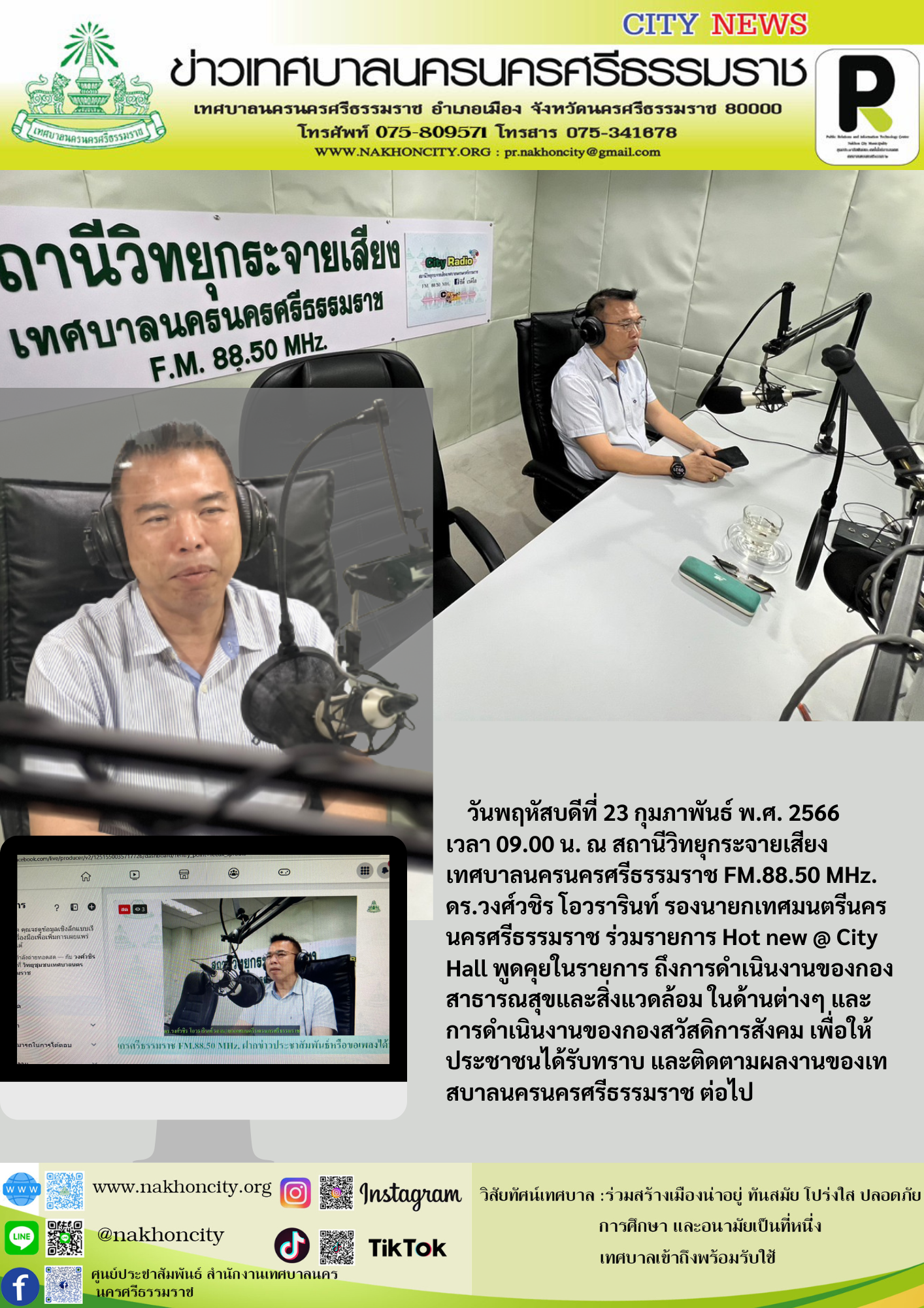 | วันพฤหัสบดีที่ 23 กุมภาพันธ์ พ.ศ. 2566 เวลา 09.00 น. ณ สถานีวิทยุกระจายเสียง เทศบาลนครนครศรีธรรมราช FM.88.50 MHz. ดร.วงศ์วชิร โอวรารินท์ รองนายกเทศมนตรีนครนครศรีธรรมราช ร่วมรายการ Hot new @ City Hall พูดคุยในรายการ ถึงการดำเนินงานของกองสาธารณสุขและสิ่งแวดล้อม ในด้านต่างๆ และการดำเนินงานของกองสวัสดิการสังคม เพื่อให้ประชาชนได้รับทราบ และติดตามผลงานของเทสบาลนครนครศรีธรรมราช ต่อไป |