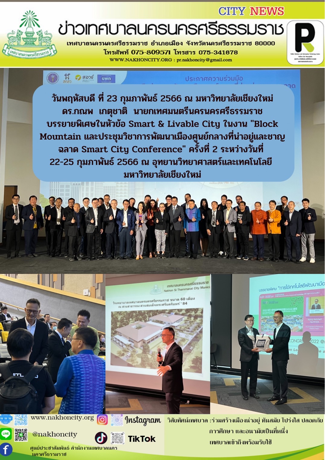 | นายกเทศมนตรีนครนครศรีธรรมราช บรรยายพิเศษในหัวข้อ Smart & Livable City ในงาน "Block Mountain และประชุมวิชาการพัฒนาเมืองศูนย์กลางที่น่าอยู่และชาญฉลาด Smart City Conference" ครั้งที่ 2 ระหว่างวันที่ 22-25 กุมภาพันธ์ 2566 ณ อุทยานวิทยาศาสตร์และเทคโนโลยี มหาวิทยาลัยเชียงใหม่ |