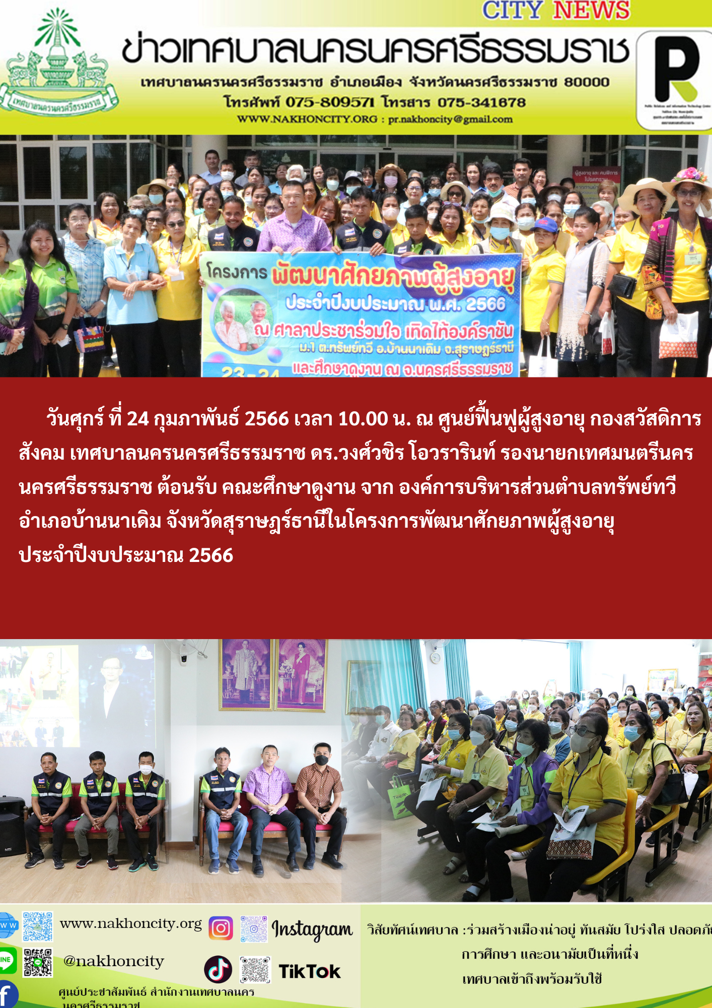 | วันศุกร์ ที่ 24 กุมภาพันธ์ 2566 เวลา 10.00 น. ณ ศูนย์ฟื้นฟูผู้สูงอายุ กองสวัสดิการสังคม เทศบาลนครนครศรีธรรมราช ดร.วงศ์วชิร โอวรารินท์ รองนายกเทศมนตรีนครนครศรีธรรมราช ต้อนรับ คณะศึกษาดูงาน จาก องค์การบริหารส่วนตำบลทรัย์ทวี อำเภอบ้านนาเดิม จังหวัดสุราษฎร์ธานีในโครงการพัฒนาศักยภาพผู้สูงอายุ ประจำปีงบประมาณ 2566 |