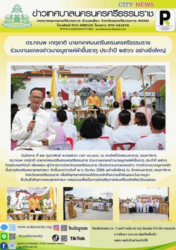 | วันอังคาร ที่ 28 กุมภาพันธ์ พ.ศ.2566 เวลา 16.00 น. ณ ลานโพธิ์วัดพระมหาธาตุ วรมหาวิหาร ดร.กณพ เกตุชาติ นายกเทศมนตรีนครนครศรีธรรมราช ร่วมงานแถลงข่าวมาฆบูชาแห่ผ้าขึ้นธาตุ ประจำปี 2566 โดยมีนายอภินันท์ เผือกผ่อง ผู้ว่าราชการจังหวัดนครศรีธรรมราช เป็นประธานงานแถลงข่าว การจัดงานมาฆบูชาแห่ผ้าขึ้นธาตุส่งเสริมพระพุทธศาสนา จัดขึ้นระหว่างวันที่ 2-6 มีนาคม 2566 อย่างยิ่งใหญ่ ณ วัดพระมหาธาตุ วรมหาวิหาร จังหวัดนครศรีธรรมราช เพื่อให้พุทธศาสนิกชนได้ตระหนักถึงความสำคัญของวันมาฆบูชา ซึ่งวันสำคัญทางพระพุทธศาสนา ตลอดจนเพื่อเป็นการส่งเสริมการท่องเที่ยวเชิงศิลปวัฒนธรรม ............ ภาพ//ข่าว//จันทร์จิรา |