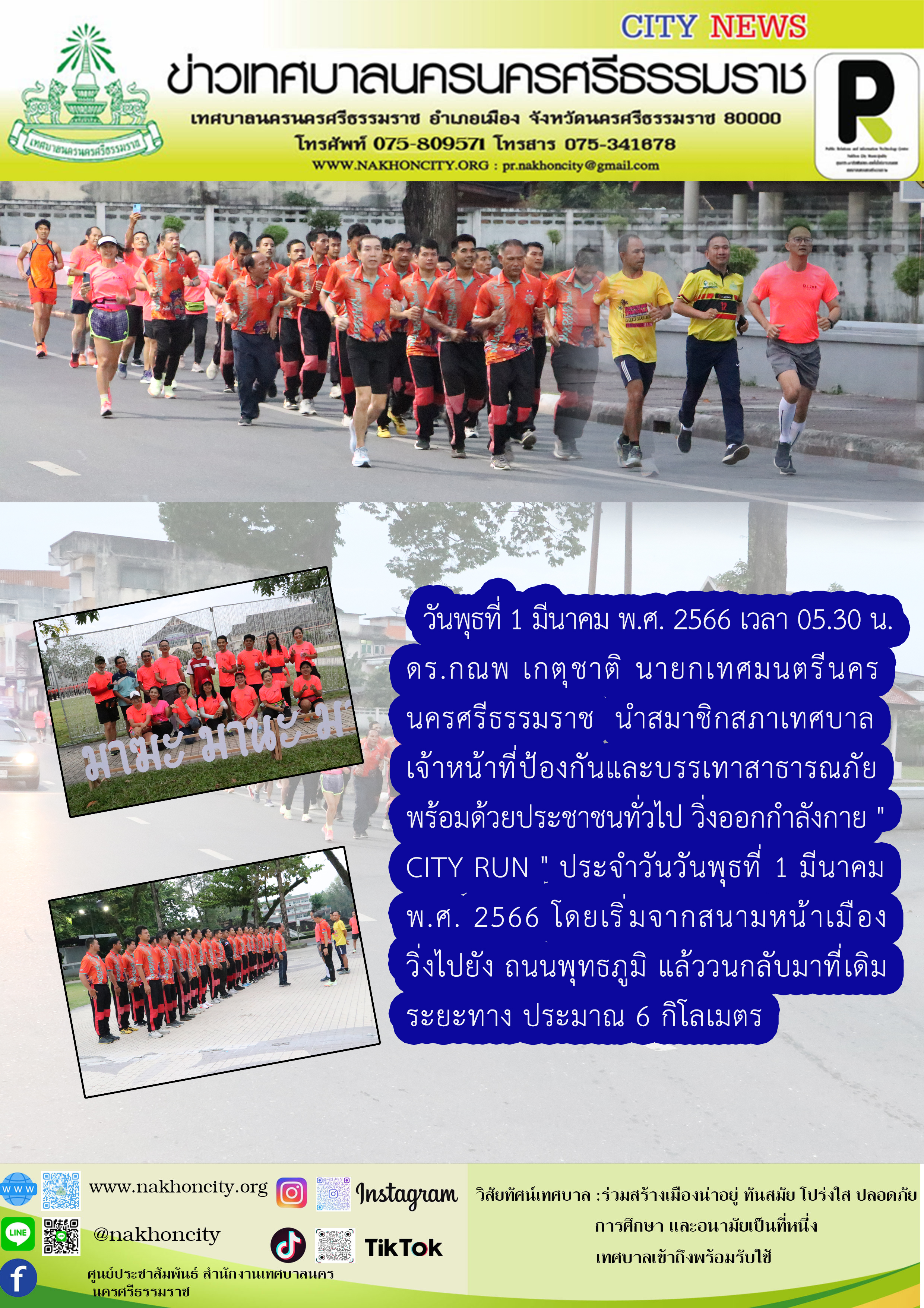 | วันพุธที่ 1 มีนาคม พ.ศ. 2566 เวลา 05.30 น. ดร.กณพ เกตุชาติ นายกเทศมนตรีนครนครศรีธรรมราช นำสมาชิกสภาเทศบาล เจ้าหน้าที่ป้องกันและบรรเทาสาธารณภัย พร้อมด้วยประชาชนทั่วไป วิ่งออกกำลังกาย " CITY RUN " ประจำวันวันพุธที่ 1 มีนาคม พ.ศ. 2566โดยเริ่มจากสนามหน้าเมือง วิ่งไปยังถนนพุทธภูมิ แล้ววนกลับมาที่เดิม ระยะทางประมาณ 6 กิโลเมตร