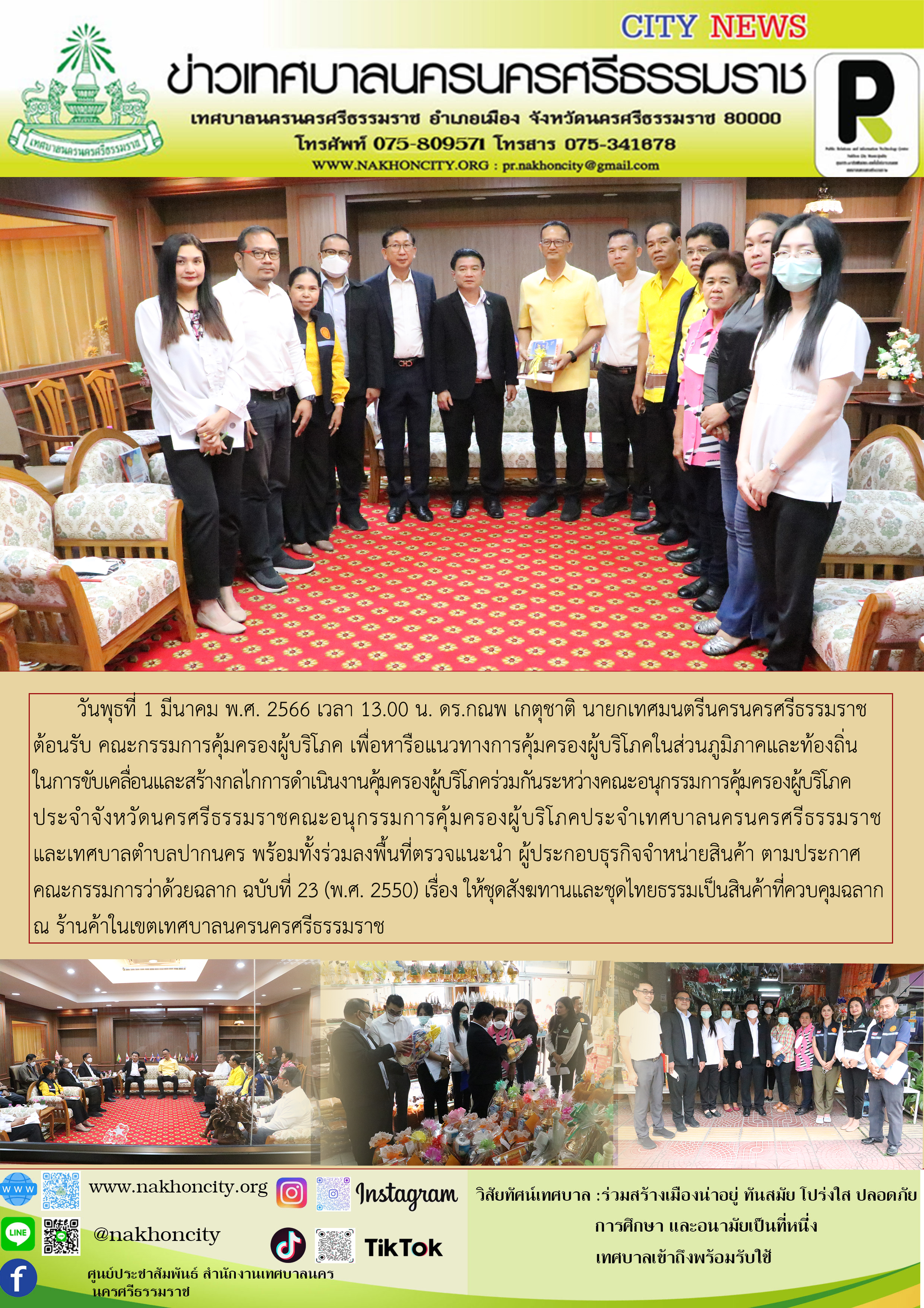| วันพุธที่ 1 มีนาคม พ.ศ. 2566 เวลา 13.00 น. ดร.กณพ เกตุชาติ นายกเทศมนตรีนครนครศรีธรรมราช ต้อนรับ คณะกรรมการคุ้มครองผู้บริโภค เพื่อหารือแนวทางการคุ้มครองผู้บริโภคในส่วนภูมิภาคและท้องถิ่น ในการขับเคลื่อนและสร้างกลไกการดำเนินงานคุ้มครองผู้บริโภคร่วมกันระหว่างคณะอนุกรรมการคุ้มครองผู้บริโภคประจำจังหวัดนครศรีธรรมราช คณะอนุกรรมการคุ้มครองผู้บริโภคประจำเทศบาลนครนครศรีธรรมราชและเทศบาลตำบลปากนคร พร้อมทั้งร่วมลงพื้นที่ตรวจแนะนำผู้ประกอบธุรกิจจำหน่ายสินค้าตามประกาศคณะกรรมการว่าด้วยฉลาก ฉบับที่ 23 (พ.ศ. 2550) เรื่อง ให้ชุดสังฆทานและชุดไทยธรรมเป็นสินค้าที่ควบคุมฉลาก ณ ร้านค้าในเขตเทศบาลนครนครศรีธรรมราช ภาพ//ข่าว//ไกรสิทธิ |