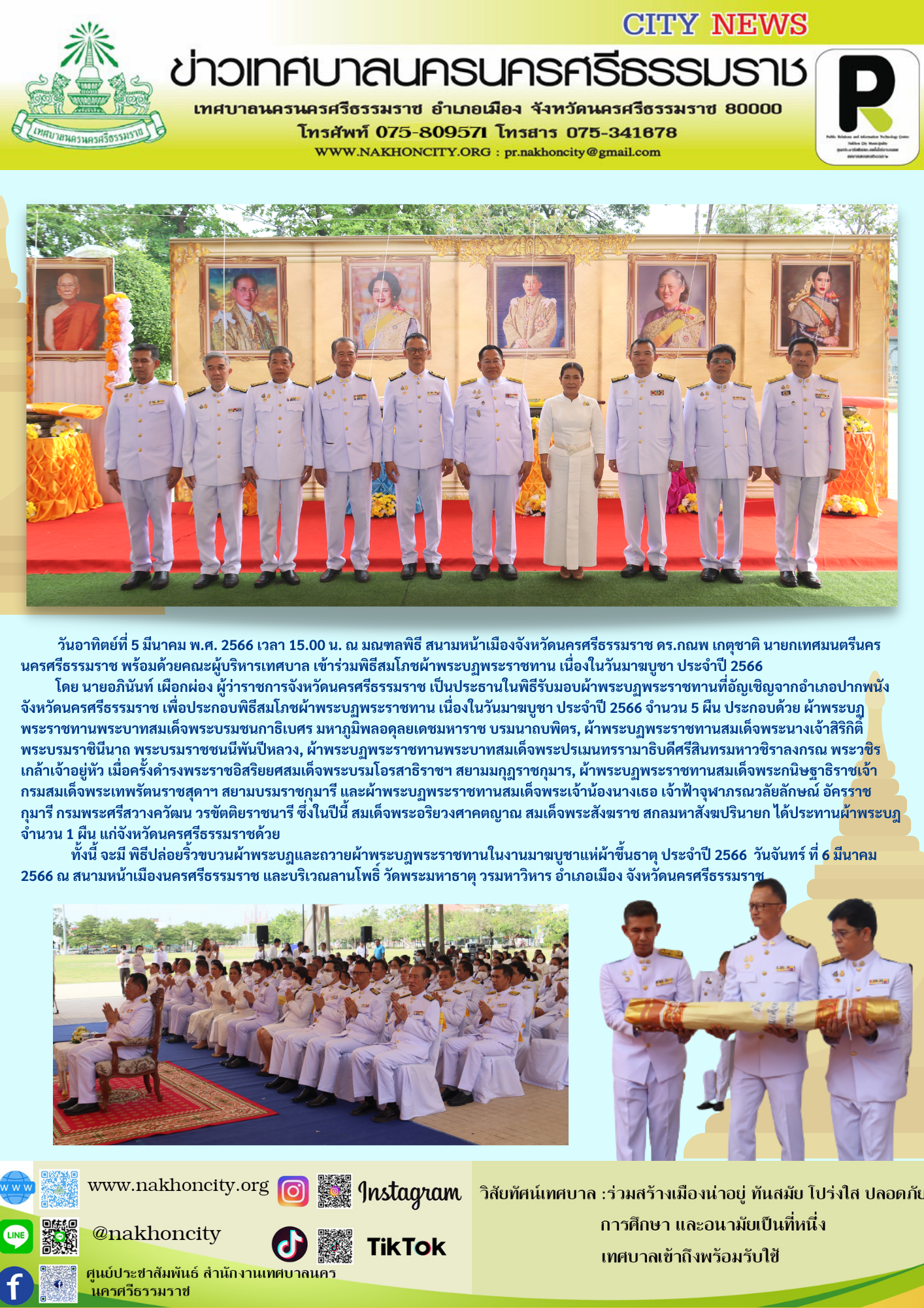| วันอาทิตย์ที่ 5 มีนาคม พ.ศ. 2566 เวลา 15.00 น. ณ มณฑลพิธี สนามหน้าเมืองจังหวัดนครศรีธรรมราช ดร.กณพ เกตุชาติ นายกเทศมนตรีนครนครศรีธรรมราช พร้อมด้วยคณะผู้บริหารเทศบาล เข้าร่วมพิธีสมโภชผ้าพระบฏพระราชทาน เนื่องในวันมาฆบูชา ประจำปี 2566 โดย นายอภินันท์ เผือกผ่อง ผู้ว่าราชการจังหวัดนครศรีธรรมราช เป็นประธานในพิธีรับมอบผ้าพระบฏพระราชทานที่อัญเชิญจากอำเภอปากพนัง จังหวัดนครศรีธรรมราช เพื่อประกอบพิธีสมโภชผ้าพระบฏพระราชทาน เนื่องในวันมาฆบูชา ประจำปี 2566 จำนวน 5 ผืน ประกอบด้วย ผ้าพระบฏพระราชทานพระบาทสมเด็จพระบรมชนกาธิเบศร มหาภูมิพลอดุลยเดชมหาราช บรมนาถบพิตร, ผ้าพระบฏพระราชทานสมเด็จพระนางเจ้าสิริกิติ์ พระบรมราชินีนาถ พระบรมราชชนนีพันปีหลวง, ผ้าพระบฏพระราชทานพระบาทสมเด็จพระปรเมนทรรามาธิบดีศรีสินทรมหาวชิราลงกรณ พระวชิรเกล้าเจ้าอยู่หัว เมื่อครั้งดำรงพระราชอิสริยยศสมเด็จพระบรมโอรสาธิราชฯ สยามมกุฎราชกุมาร, ผ้าพระบฏพระราชทานสมเด็จพระกนิษฐาธิราชเจ้า กรมสมเด็จพระเทพรัตนราชสุดาฯ สยามบรมราชกุมารี และผ้าพระบฏพระราชทานสมเด็จพระเจ้าน้องนางเธอ เจ้าฟ้าจุฬาภรณวลัยลักษณ์ อัครราชกุมารี กรมพระศรีสวางควัฒน วรขัตติยราชนารี ซึ่งในปีนี้ สมเด็จพระอริยวงศาคตญาณ สมเด็จพระสังฆราช สกลมหาสังฆปรินายก ได้ประทานผ้าพระบฎ จำนวน 1 ผืน แก่จังหวัดนครศรีธรรมราชด้วย ทั้งนี้ จะมี พิธีปล่อยริ้วขบวนผ้าพระบฎและถวายผ้าพระบฎพระราชทานในงานมาฆบูชาแห่ผ้าขึ้นธาตุ ประจำปี 2566 วันจันทร์ ที่ 6 มีนาคม 2566 ณ สนามหน้าเมืองนครศรีธรรมราช และบริเวณลานโพธิ์ วัดพระมหาธาตุ วรมหาวิหาร อำเภอเมือง จังหวัดนครศรีธรรมราช |