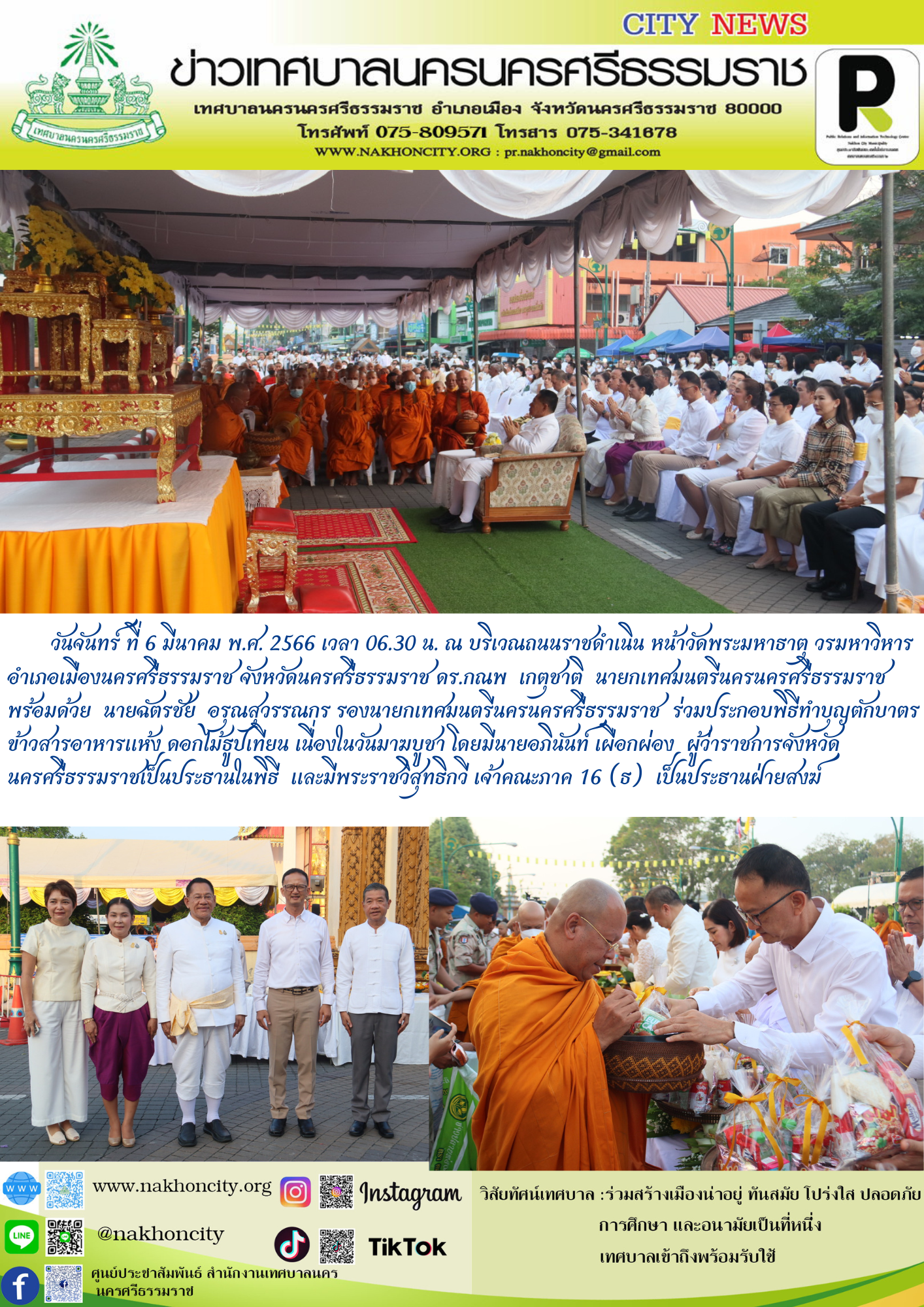 | ดร.กณพ เกตุชาติ นายกเทศมนตรีนครนครศรีธรรมราช พร้อมด้วย นายฉัตรชัย อรุณสุวรรณกร รองนายกเทศมนตรีนครนครศรีธรรมราช ร่วมประกอบพิธีทำบุญตักบาตร ข้าวสาร อาหารแห้ง ดอกไม้ธูปเทียน เนื่องในวันมาฆบูชา ประจำปี 2566 |