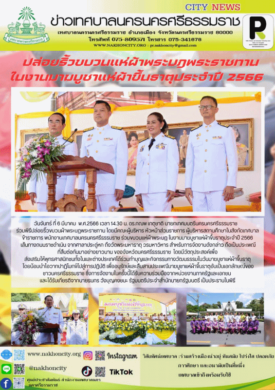 | วันจันทร์ ที่ 6 มีนาคม พ.ศ.2566 เวลา 14.30 น. ดร.กณพ เกตุชาติ นายกเทศมนตรีนครนครศรีธรรมราช ร่วมพิธีปล่อยริ้วขบวนผ้าพระบฏพระราชทาน โดยมีคณะผู้บริหาร หัวหน้าส่วนราชการ ผู้บริหารสถานศึกษาในสังกัดเทศบาล ข้าราชการ พนักงานเทศบาลนครนครศรีธรรมราช ร่วมขบวนแห่ผ้าพระบฎ ในงานมาฆบูชาแห่ผ้าขึ้นธาตุประจำปี 2566 เส้นทางถนนราชดำเนิน จากศาลาประดู่หก ถึงวัดพระมหาธาตุ วรมหาวิหาร สำหรับการจัดงานดังกล่าว ถือเป็นประเพณีที่สืบต่อกันมาอย่างยาวนาน ของจังหวัดนครศรีธรรมราช โดยมีวัตถุประสงค์เพื่อส่งเสริมให้พุทธศาสนิกชนทั้งในและต่างประเทศได้ร่วมทำบุญและกิจกรรมทางวัฒนธรรมในวันมาฆบูชาแห่ผ้าขึ้นธาตุ โดยน้อมนำโอวาทปาฏิโมกข์ไปสู่การปฏิบัติ เพื่ออนุรักษ์และสืบสานประเพณีมาฆบูชาแห่ผ้าขึ้นธาตุอันเป็นเอกลักษณ์ของชาวนครศรีธรรมราช ซึ่งการจัดงานในครั้งนี้ได้รับความร่วมมือจากหน่วยงานภาครัฐและเอกชน และได้รับเกียรติจากนายธนกร วังบุญคงชนะ รัฐมนตรีประจำสำนักนายกรัฐมนตรี เป็นประธานในพิธี …………… ภาพ//ข่าว//จันทร์จิรา ตรวจทาน//ฐิตินันท์ |