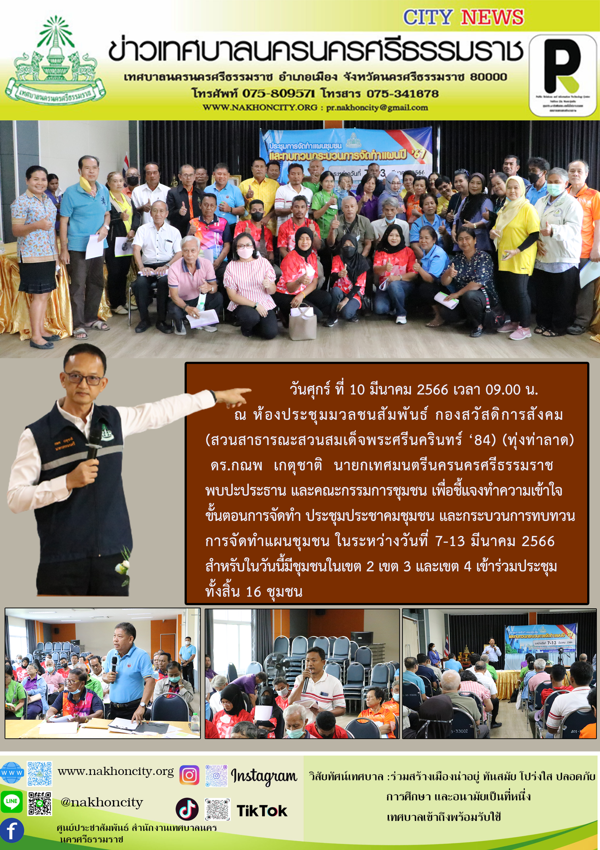 | วันศุกร์ ที่ 10 มีนาคม 2566 เวลา 09.00 น. ณ ห้องประชุมมวลชนสัมพันธ์ กองสวัสดิการสังคม (สวนสาธารณะสวนสมเด็จพระศรีนครินทร์ ‘84) (ทุ่งท่าลาด) ดร.กณพ เกตุชาติ นายกเทศมนตรีนครนครศรีธรรมราช พบปะประธานและคณะกรรมการชุมชน เพื่อชี้แจงทำความเข้าใจขั้นตอนการจัดทำประชุมประชาคมชุมชน และกระบวนการทบทวนการจัดทำแผนชุมชน ในระหว่างวันที่ 7-13 มีนาคม 2566 สำหรับในวันนี้มีชุมชนในเขต 2 เขต 3 และเขต 4 เข้าร่วมประชุมทั้งสิ้น 16 ชุมชน