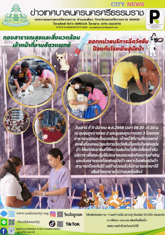 | วันเสาร์ ที่ 11 มีนาคม พ.ศ.2566 เวลา 09.30 -11.30 น. ณ ชุมชนคูขวางเขต 2 และชุมชนคูขวางเขต 3 โดยกองสาธารณสุขและสิ่งแวดล้อม เจ้าหน้าที่งานสัตวแพทย์ ลงพื้นที่ออกหน่วยบริการฉีดวัคซีนป้องกันโรคพิษสุนัขบ้า ให้แก่ประชาชนที่ให้ความสนใจนำสัตว์เลี้ยงเข้ารับบริการ เพื่อกระตุ้นให้ประชาชนตระหนักถึงความสำคัญและอันตรายของโรคพิษสุนัขบ้า เพราะโรคพิษสุนัขบ้าสามารถป้องกันได้ แต่ถ้าป่วยแล้วไม่สามารถรักษาได้ เสียชีวิตทุกรายไม่ว่าคนหรือสัตว์ ซึ่งในวันนี้มีประชาชนทยอยนำสัตว์เลี้ยง สุนัขและแมว มาลงทะเบียนแจ้งชื่อ อายุของสัตว์เลี้ยงรับบริการฉีดวัคซีนป้องกันโรคพิษสุนัขบ้า รับใบรับรองและป้ายโลหะไปคล้องคอสัตว์เลี้ยง สามารถติดต่อสอบถามได้ที่สถานพยาบาลสัตว์ทุ่งท่าลาด โทร.075 358292 ( วัน-เวลาราชการ ) ................... ภาพ//ข่าว//จันทร์จิรา |
