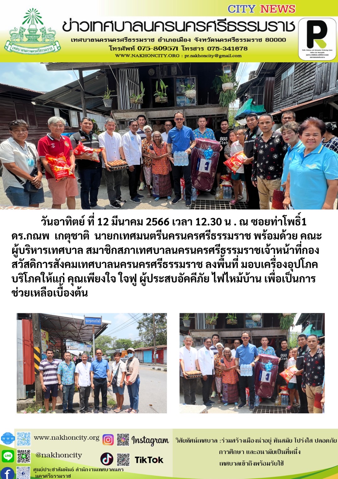 | ดร.กณพ เกตุชาติ นายกเทศมนตรีนครนครศรีธรรมราช พร้อมด้วย คณะผู้บริหารเทศบาล สมาชิกสภาเทศบาลนครนครศรีธรรมราชเจ้าหน้าที่กองสวัสดิการสังคมเทศบาลนครนครศรีธรรมราช ลงพื้นที่ มอบเครื่องอุปโภคบริโภคให้แก่ คุณเพียงใจ ใจฟู ผู้ประสบอัคคีภัย ไฟไหม้บ้าน เพื่อเป็นการช่วยเหลือเบื้องต้น |