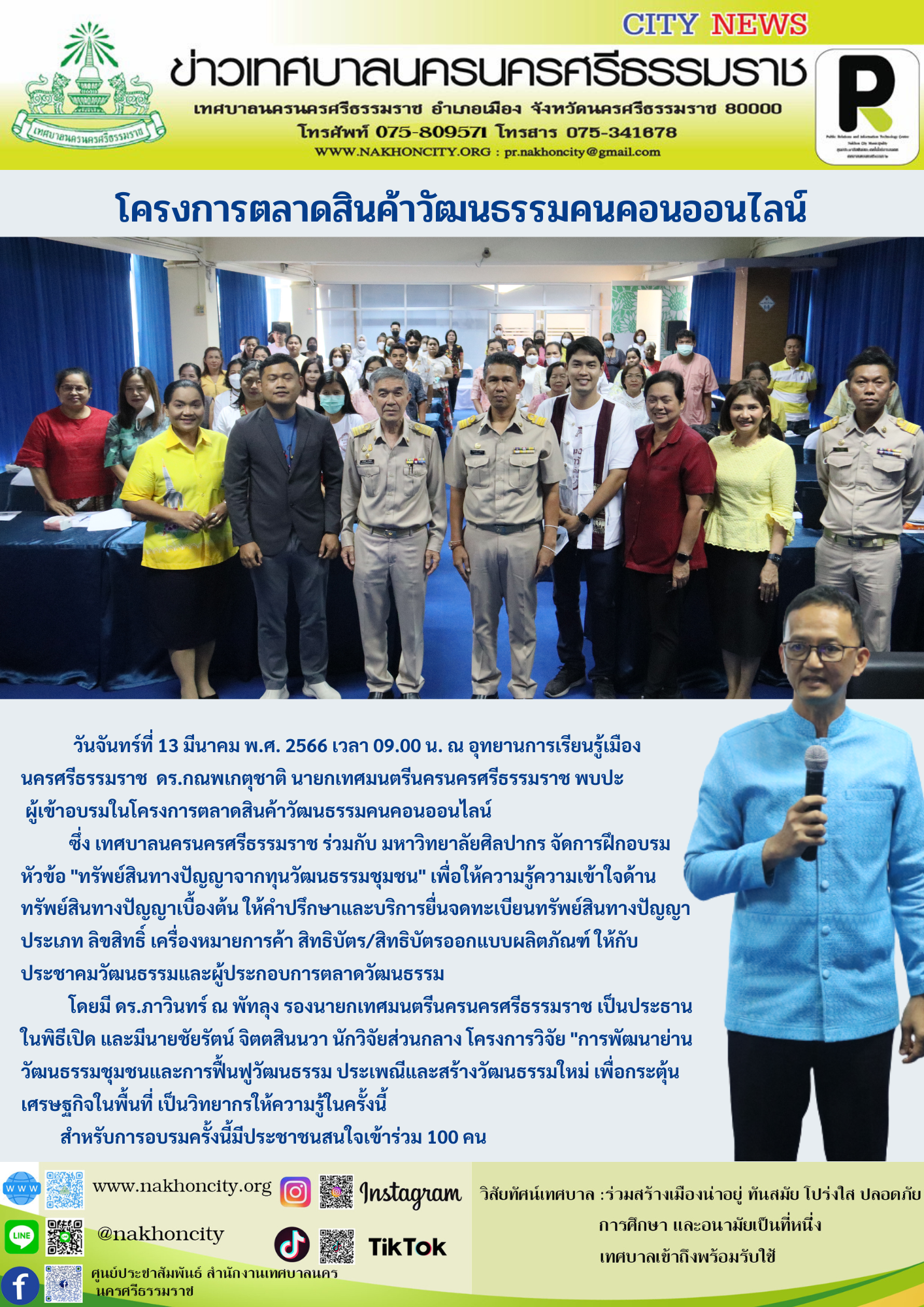 | วันจันทร์ที่ 13 มีนาคม พ.ศ. 2566 เวลา 09.00 น. ณ อุทยานการเรียนรู้เมืองนครศรีธรรมราช ดร.กณพ เกตุชาติ นายกเทศมนตรีนครนครศรีธรรมราช พบปะ ผู้เข้าอบรมในโครงการตลาดสินค้าวัฒนธรรมคนคอนออนไลน์ ซึ่ง เทศบาลนครนครศรีธรรมราช ร่วมกับ มหาวิทยาลัยศิลปากร จัดการฝึกอบรม หัวข้อ "ทรัพย์สินทางปัญญาจากทุนวัฒนธรรมชุมชน" เพื่อให้ความรู้ความเข้าใจด้านทรัพย์สินทางปัญญาเบื้องต้น ให้คำปรึกษาและบริการยื่นจดทะเบียนทรัพย์สินทางปัญญา ประเภท ลิขสิทธิ์ เครื่องหมายการค้า สิทธิบัตร/สิทธิบัตรออกแบบผลิตภัณฑ์ ให้กับประชาคมวัฒนธรรมและผู้ประกอบการตลาดวัฒนธรรม โดยมี ดร.ภาวินทร์ ณ พัทลุง รองนายกเทศมนตรีนครนครศรีธรรมราช เป็นประธานในพิธีเปิด และมีนายชัยรัตน์ จิตตสินนวา นักวิจัยส่วนกลาง โครงการวิจัย "การพัฒนาย่านวัฒนธรรมชุมชนและการฟื้นฟูวัฒนธรรม ประเพณีและสร้างวัฒนธรรมใหม่ เพื่อกระตุ้นเศรษฐกิจในพื้นที่ เป็นวิทยากรให้ความรู้ในครั้งนี้ สำหรับการอบรมครั้งนี้มีประชาชนสนใจเข้าร่วม 100 คน |
