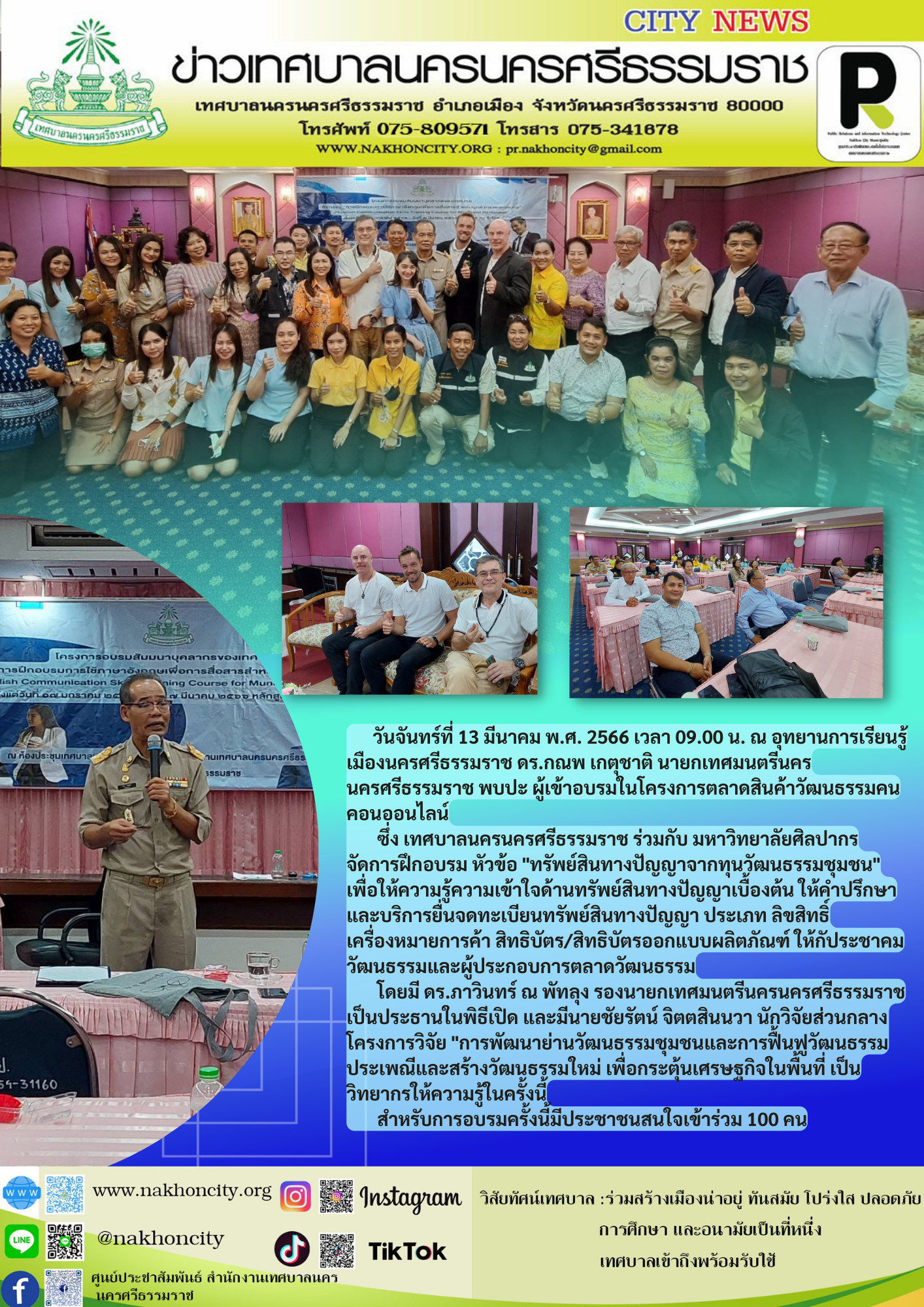 | วันจันทร์ที่ 13 มีนาคม พ.ศ. 2566 เวลา 09.00 น. ณ อุทยานการเรียนรู้เมืองนครศรีธรรมราช ดร.กณพ เกตุชาติ นายกเทศมนตรีนครนครศรีธรรมราช พบปะ ผู้เข้าอบรมในโครงการตลาดสินค้าวัฒนธรรมคนคอนออนไลน์ ซึ่ง เทศบาลนครนครศรีธรรมราช ร่วมกับ มหาวิทยาลัยศิลปากร จัดการฝึกอบรม หัวข้อ "ทรัพย์สินทางปัญญาจากทุนวัฒนธรรมชุมชน" เพื่อให้ความรู้ความเข้าใจด้านทรัพย์สินทางปัญญาเบื้องต้น ให้คำปรึกษาและบริการยื่นจดทะเบียนทรัพย์สินทางปัญญา ประเภท ลิขสิทธิ์ เครื่องหมายการค้า สิทธิบัตร/สิทธิบัตรออกแบบผลิตภัณฑ์ ให้กับประชาคมวัฒนธรรมและผู้ประกอบการตลาดวัฒนธรรม โดยมี ดร.ภาวินทร์ ณ พัทลุง รองนายกเทศมนตรีนครนครศรีธรรมราช เป็นประธานในพิธีเปิด และมีนายชัยรัตน์ จิตตสินนวา นักวิจัยส่วนกลาง โครงการวิจัย "การพัฒนาย่านวัฒนธรรมชุมชนและการฟื้นฟูวัฒนธรรม ประเพณีและสร้างวัฒนธรรมใหม่ เพื่อกระตุ้นเศรษฐกิจในพื้นที่ เป็นวิทยากรให้ความรู้ในครั้งนี้ สำหรับการอบรมครั้งนี้มีประชาชนสนใจเข้าร่วม 100 คน |