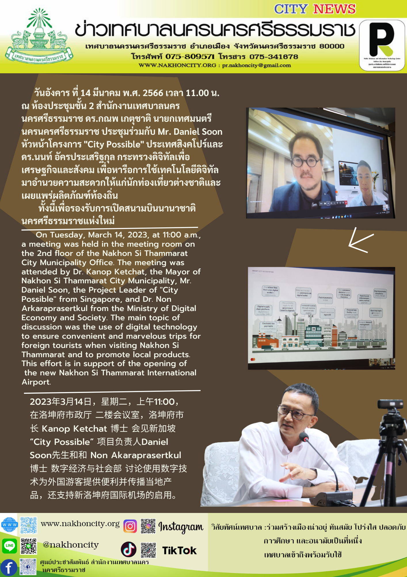 | วันอังคาร ที่ 14 มีนาคม พ.ศ. 2566 เวลา 11.00 น. ณ ห้องประชุมชั้น 2 สำนักงานเทศบาลนครนครศรีธรรมราช ดร.กณพ เกตุชาติ นายกเทศมนตรีนครนครศรีธรรมราช ประชุมร่วมกับ Mr. Daniel Soon หัวหน้าโครงการ "City Possible" ประเทศสิงคโปร์และ ดร.นนท์ อัครประเสริฐกุล กระทรวงดิจิทัลเพื่อเศรษฐกิจและสังคม เพื่อหารือการใช้เทคโนโลยีดิจิทัลมาอำนวยความสะดวกให้แก่นักท่องเที่ยวต่างชาติและเผยแพร่ผลิตภัณฑ์ท้องถิ่น  On Tuesday, March 14, 2023, at 11:00 a.m., a meeting was held in the meeting room on the 2nd floor of the Nakhon Si Thammarat City Municipality Office. The meeting was attended by Dr. Kanop Ketchat, the Mayor of Nakhon Si Thammarat City Municipality, Mr. Daniel Soon, the Project Leader of "City Possible" from Singapore, and Dr. Non Arkaraprasertkul from the Ministry of Digital Economy and Society. The main topic of discussion was the use of digital technology to ensure convenient and marvelous trips for foreign tourists when visiting Nakhon Si Thammarat and to promote local products. This effort is in support of the opening of the new Nakhon Si Thammarat International Airport. 2023年3月14日,星期二,上午11:00,在洛坤府市政厅 二楼会议室,洛坤府市长 Kanop Ketchat 博士 会见新加坡 “City Possible” 项目负责人Daniel Soon先生和和 Non Akaraprasertkul 博士 数字经济与社会部 讨论使用数字技术为外国游客提供便利并传播当地产品,还支持新洛坤府国际机场的启用。 |