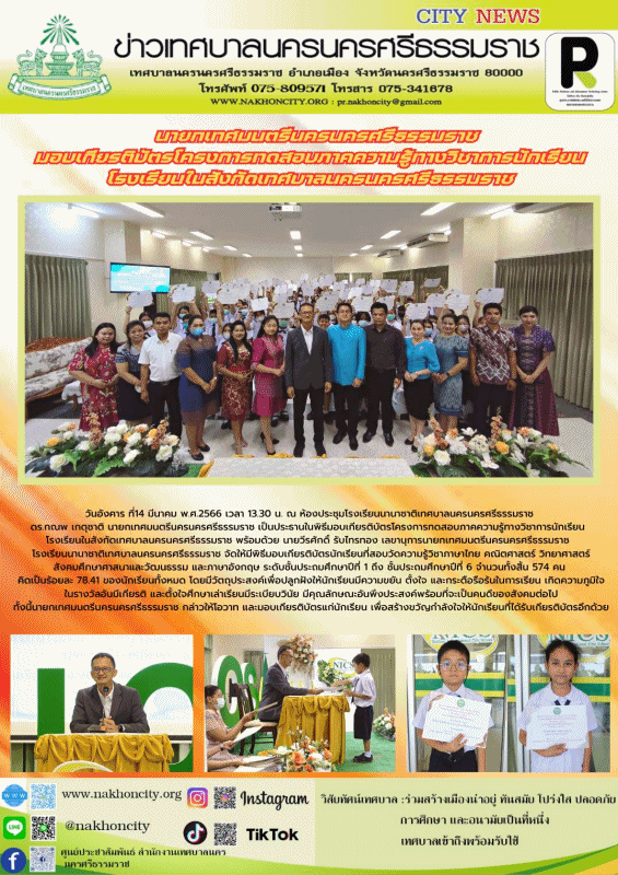 | นายกเทศมนตรีนครนครศรีธรรมราช มอบเกียรติบัตรโครงการทดสอบภาคความรู้ทางวิชาการนักเรียน โรงเรียนในสังกัดเทศบาลนครนครศรีธรรมราช |