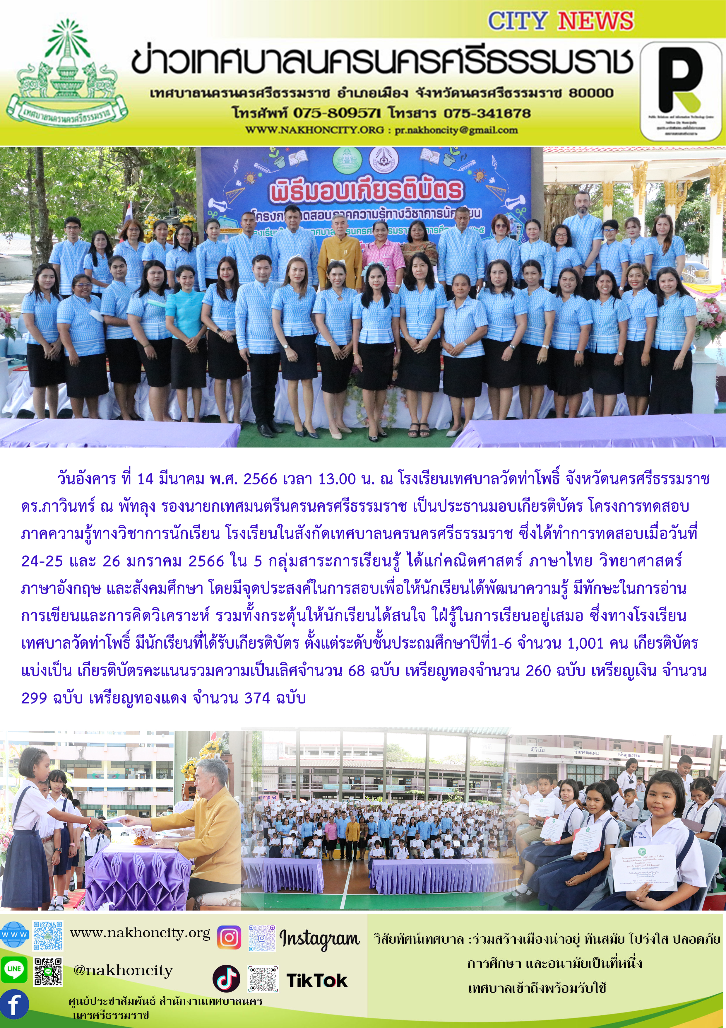 | ดร.ภาวินทร์ ณ พัทลุง รองนายกเทศมนตรีนครนครศรีธรรมราช เป็นประธานมอบเกียรติบัตรโครงการทดสอบภาคความรู้ทางวิชาการนักเรียน โรงเรียนในสังกัดเทศบาลนครนครศรีธรรมราช ซึ่งได้ทำการทดสอบเมื่อวันที่ 24-25 และ 26 มกราคม 2566 ใน 5 กลุ่มสาระการเรียนรู้ ได้แก่คณิตศาสตร์ ภาษาไทย วิทยาศาสตร์ ภาษาอังกฤษ และสังคมศึกษา |