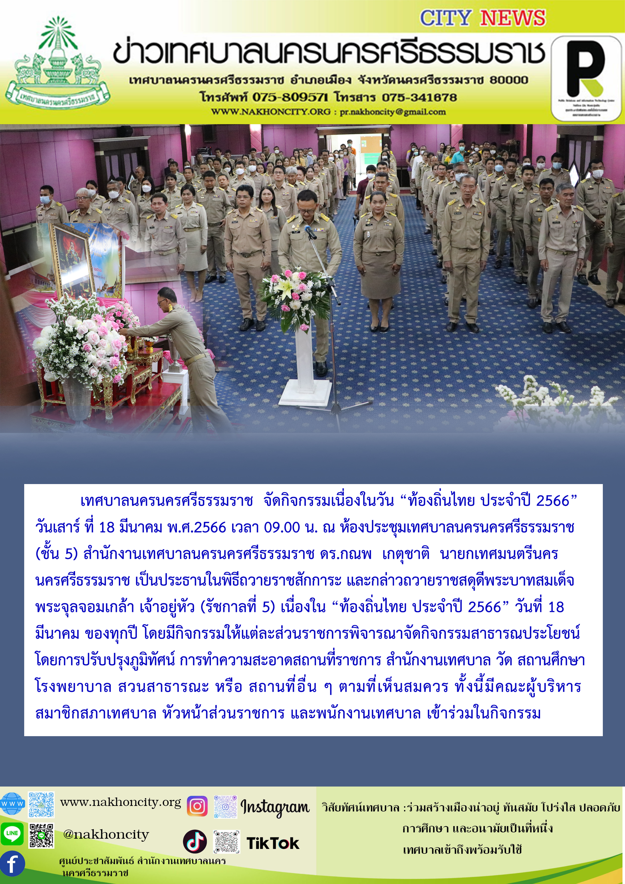 | เทศบาลนครนครศรีธรรมราช  จัดกิจกรรมเนื่องในวัน “ท้องถิ่นไทย ประจำปี 2566” วันเสาร์ ที่ 18 มีนาคม พ.ศ.2566 เวลา 09.00 น. ณ ห้องประชุมเทศบาลนครนครศรีธรรมราช (ชั้น 5) ภาพ//ไกรสิทธิ //จันทร์จิรา |