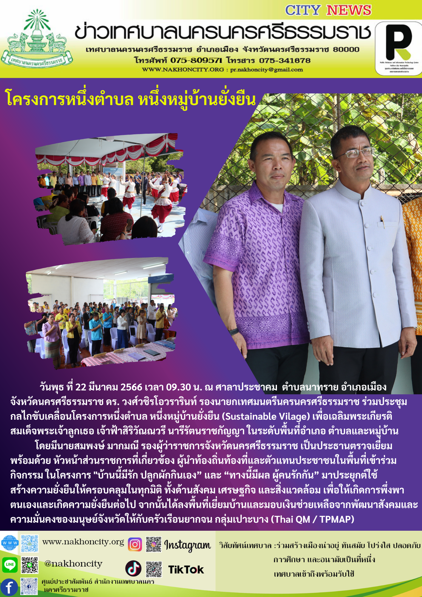| วันพุธ ที่ 22 มีนาคม 2566 เวลา 09.30 น. ณ ศาลาประชาคม หมู่ที่ 4 ตำบลนาทราย อำเภอเมืองนครศรีธรรมราช จังหวัดนครศรีธรรมราช ดร. วงศ์วชิร โอวรารินท์ รองนายกเทศมนตรีนครนครศรีธรรมราช ร่วม ประชุมกลไกขับเคลื่อนโครงการหนึ่งตำบล หนึ่งหมู่บ้านยั่งยืน (Sustainable Vilage) เพื่อเฉลิมพระเกียรติสมเด็จพระเจ้าลูกเธอ เจ้าฟ้าสิริวัณณวรี นารีรัตนราชกัญญา ในระดับพื้นที่อำเภอ ตำบลและหมู่บ้าน โดยมีนายสมพงษ์ มากมณี รองผู้ว่าราชการจังหวัดนครศรีธรรมราช เป็นประธานตรวจเยี่ยม พร้อมด้วย หัวหน้าส่วนราชการที่เกี่ยวข้อง ผู้นำท้องถิ่นท้องที่และตัวแทนประชาชนในพื้นที่เข้าร่วมกิจกรรม ในโครงการ "บ้านนี้มีรัก ปลูกผักกินเอง” และ “ทางนี้มีผล ผู้คนรักกัน” มาประยุกต์ใช้ สร้างความยั่งยืนให้ครอบคลุมในทุกมิติ ทั้งด้านสังคม เศรษฐกิจ และสิ่งแวดล้อม เพื่อให้เกิดการพึ่งพาตนเองและเกิดความยั่งยืนต่อไป จากนั้นได้ลงพื้นที่เยี่ยมบ้านและมอบเงินช่วยเหลือจากพัฒนาสังคมและความมั่นคงของมนุษย์จังหวัดให้กับครัวเรือนยากจน กลุ่มเปาะบาง (Thai QM / TPMAP) |