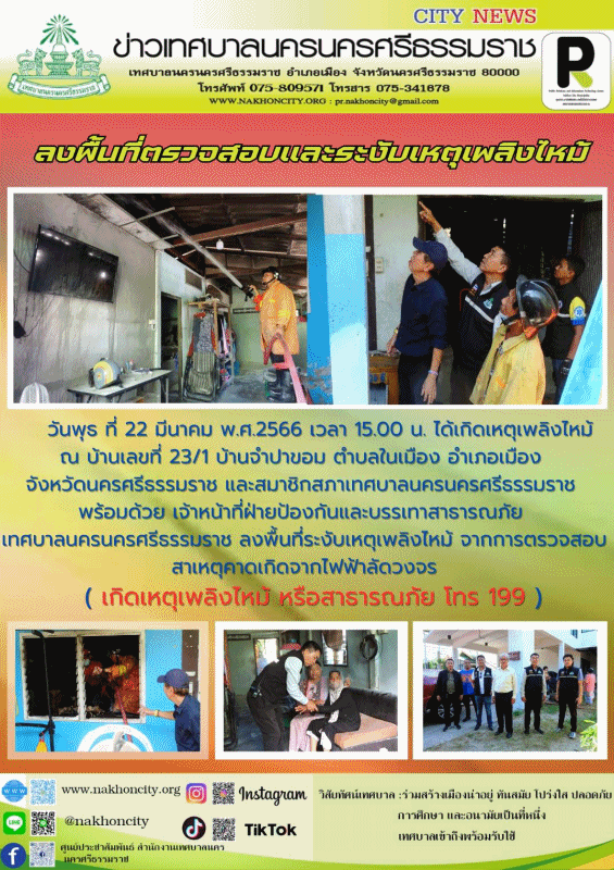 | วันพุธ ที่ 22 มีนาคม พ.ศ.2566 เวลา 15.00 น. ได้เกิดเหตุเพลิงไหม้ ณ บ้านเลขที่ 23/1 บ้านจำปาขอม ตำบลในเมือง อำเภอเมือง จังหวัดนครศรีธรรมราช และสมาชิกสภาเทศบาลนครนครศรีธรรมราช เขต 2 พร้อมด้วย เจ้าหน้าที่ฝ่ายป้องกันและบรรเทาสาธารณภัย เทศบาลนครนครศรีธรรมราช ลงพื้นที่ระงับเหตุเพลิงไหม้ จากการตรวจสอบสาเหตุคาดเกิดจากไฟฟ้าลัดวงจร เกิดเหตุเพลิงไหม้ หรือสาธารณภัย โทรสาย 199 |
