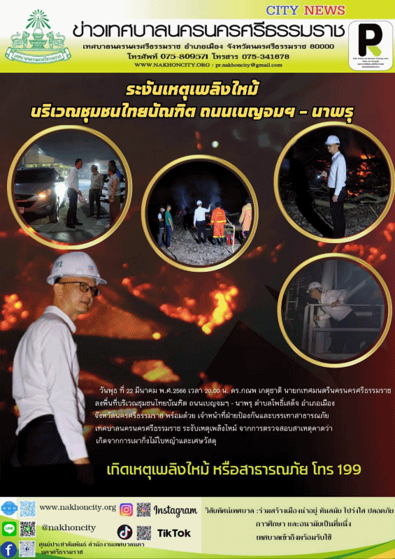 | วันพุธ ที่ 22 มีนาคม พ.ศ.2566 เวลา 20.00 น. ดร.กณพ เกตุชาติ นายกเทศมนตรีนครนครศรีธรรมราช ลงพื้นที่บริเวณชุมชนไทยบัณฑิต ถนนเบญจมฯ - นาพรุ ตำบลโพธิ์เสด็จ อำเภอเมือง จังหวัดนครศรีธรรมราช พร้อมด้วย เจ้าหน้าที่ฝ่ายป้องกันและบรรเทาสาธารณภัย เทศบาลนครนครศรีธรรมราช ระงับเหตุเพลิงไหม้ จากการตรวจสอบสาเหตุคาดว่าเกิดจากการเผากิ่งไม้ใบหญ้าและเศษวัสดุ เกิดเหตุเพลิงไหม้ หรือสาธารณภัย โทร 199 ........... ภาพ//ข่าว//จันทร์จิรา ตรวจทาน//อารีรัตน์ |