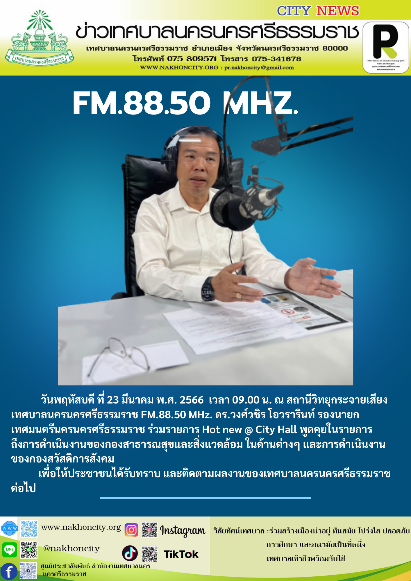 | วันพฤหัสบดี ที่ 23 มีนาคม พ.ศ. 2566 เวลา 09.00 น. ณ สถานีวิทยุกระจายเสียง เทศบาลนครนครศรีธรรมราช FM.88.50 MHz. ดร.วงศ์วชิร โอวรารินท์ รองนายกเทศมนตรีนครนครศรีธรรมราช ร่วมรายการ Hot new @ City Hall พูดคุยในรายการ ถึงการดำเนินงานของกองสาธารณสุขและสิ่งแวดล้อม ในด้านต่างๆ และการดำเนินงานของกองสวัสดิการสังคม เพื่อให้ประชาชนได้รับทราบ และติดตามผลงานของเทศบาลนครนครศรีธรรมราช ต่อไป |