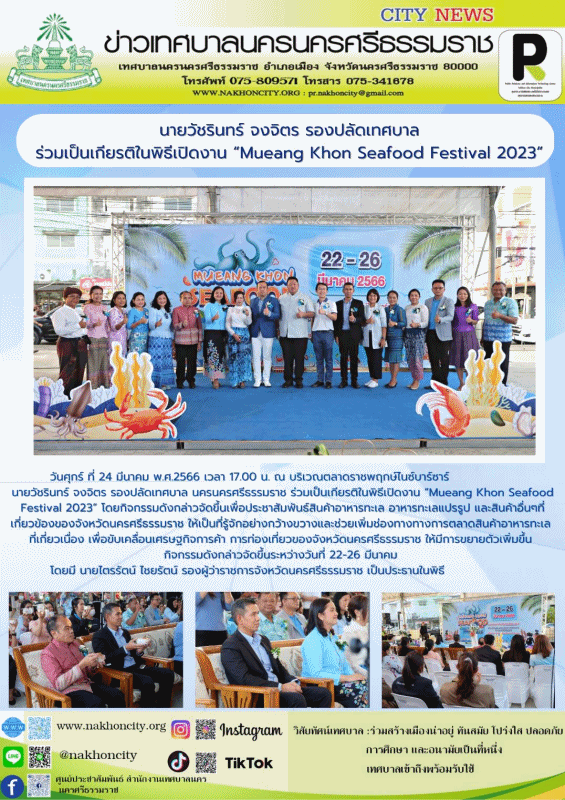 | นายวัชรินทร์ จงจิตร รองปลัดเทศบาล ร่วมเป็นเกียรติในพิธีเปิดงาน “Mueang Khon Seafood Festival 2023” |