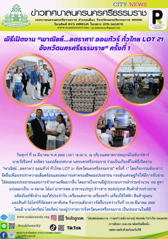 | วันศุกร์ ที่ 24 มีนาคม พ.ศ.2566 เวลา 18.00 น. ณ บริเวณตลาดราชพฤกษ์ไนซ์บาร์ซาร์ นายวัชรินทร์ จงจิตร รองปลัดเทศบาล นครนครศรีธรรมราช ร่วมเป็นเกียรติในพิธีเปิดงาน “พาณิชย์...ลดราคา! ออนทัวร์ ทั่วไทย LOT 21 จังหวัดนครศรีธรรมราช” ครั้งที่ 1” โดยกิจกรรมดังกล่าวจัดขึ้นเพื่อบรรเทาความเดือดร้อนและลดภาระค่าครองชีพของประชาชน กระตุ้นเศรษฐกิจให้มีการจับจ่ายใช้สอยของประชาชนและการจ้างงานเพิ่มมากขึ้น โดยภายในงานมีผู้ประกอบการเข้าร่วมจำนวน 100 คูหา แบ่งออกเป็น 10 หมวด ได้แก่ อาหารสด อาหารแปรรูป ข้าวสาร ซอสปรุงรส สินค้าชำระร่างกาย ผลิตภัณฑ์ซักล้าง ของใช้ประจำวัน เครื่องแต่งกาย เครื่องครัว เครื่องใช้ไฟฟ้า สินค้าชุมชน และสินค้าไฮไลท์ที่จัดลดราคาพิเศษ กิจกรรมดังกล่าวจัดขึ้นระหว่างวันที่ 22-26 มีนาคม โดยมี นายไตรรัตน์ ไชยรัตน์ รองผู้ว่าราชการจังหวัดนครศรีธรรมราช เป็นประธานในพิธี ........... ภาพ//ข่าว//จันทร์จิรา |