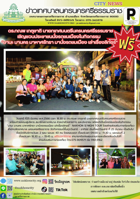 | ดร.กณพ เกตุชาติ นายกเทศมนตรีนครนครศรีธรรมราช เชิญชวนประชาชนนั่งรถชมเมืองในกิจกรรม “มานะ มานคร มาหาศรัทธา มานั่งรถชมเมือง เล่าเรื่องลิกอร์” |