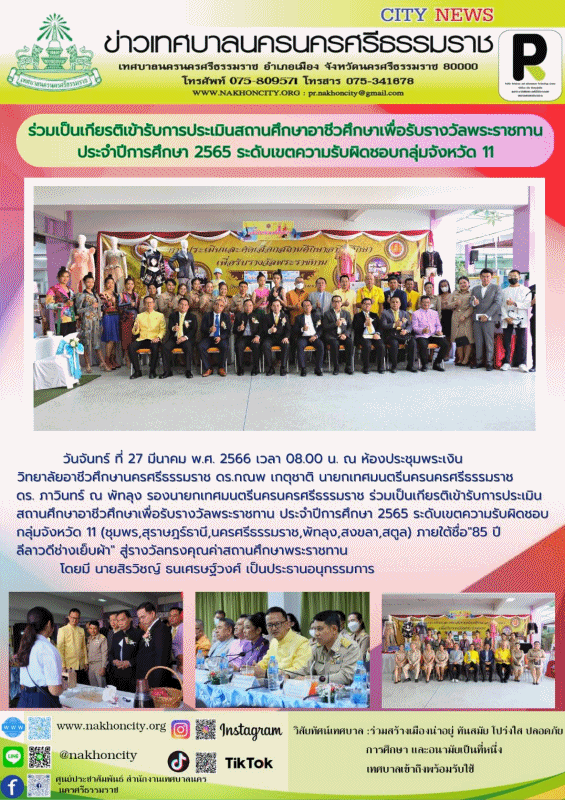 | วันจันทร์ ที่ 27 มีนาคม พ.ศ. 2566 เวลา 08.00 น. ณ ห้องประชุมพระเงิน วิทยาลัยอาชีวศึกษานครศรีธรรมราช ดร.กณพ เกตุชาติ นายกเทศมนตรีนครนครศรีธรรมราช พร้อมด้วย ดร. ภาวินทร์ ณ พัทลุง รองนายกเทศมนตรีนครนครศรีธรรมราช ร่วมเป็นเกียรติเข้ารับการประเมินสถานศึกษาอาชีวศึกษาเพื่อรับรางวัลพระราชทาน ประจำปีการศึกษา 2565 ระดับเขตความรับผิดชอบกลุ่มจังหวัด 11 (ชุมพร,สุราษฎร์ธานี,นครศรีธรรมราช,พัทลุง,สงขลา,สตูล) ภายใต้ชื่อ “ 85 ปี ลีลาวดีช่างเย็บผ้า สู่รางวัลทรงคุณค่าสถานศึกษาพระราชทาน ” โดยมี นายสิรวิชญ์ ธนเศรษฐ์วงศ์ เป็นประธานอนุกรรมการ .................. ภาพ//ข่าว//จันทร์จิรา ตรวจทาน//ฐิตินันท์ |